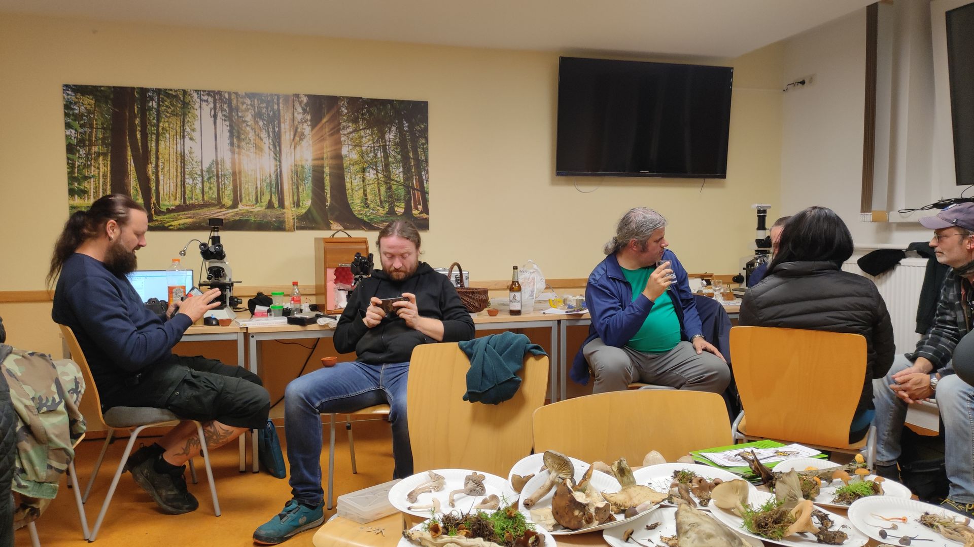 1.: Nachdem Elisabeth und Climby uns noch an ihren Erkenntnissen über einige der interessantesten Funde teilhaben ließen (Danke dafür, ich konnte wieder einiges lernen!), begann das lustige Spirituosen-Tasting. Selbst gemachte und andere Lieblingsschnäpse und -Liköre wurden verkostet, während die Stimmung langsam stieg und dem Höhepunkt des auf dem Höllenfeuer-Grill zubereiteten Abendessens zustrebte! Währenddessen wurden immer noch Pilzfunde begutachtet...