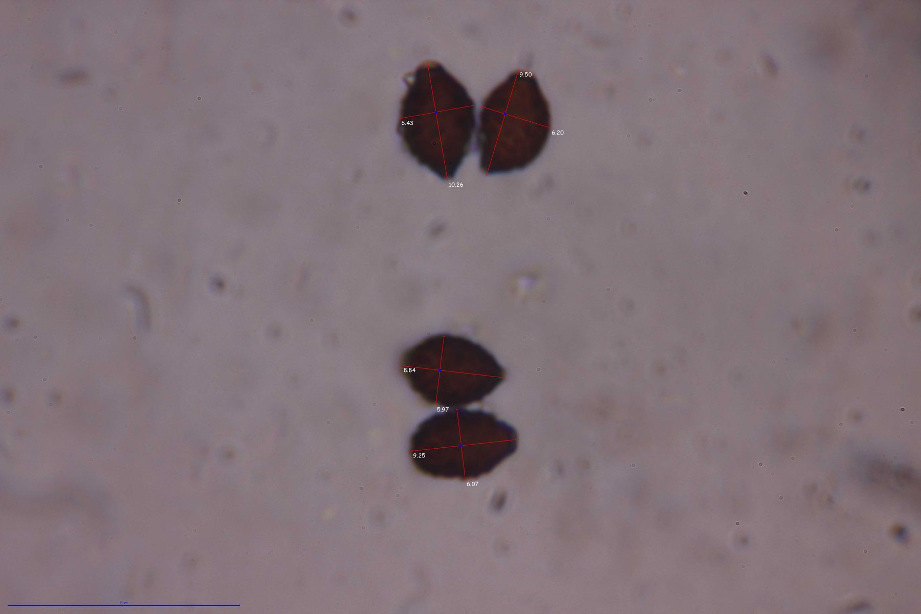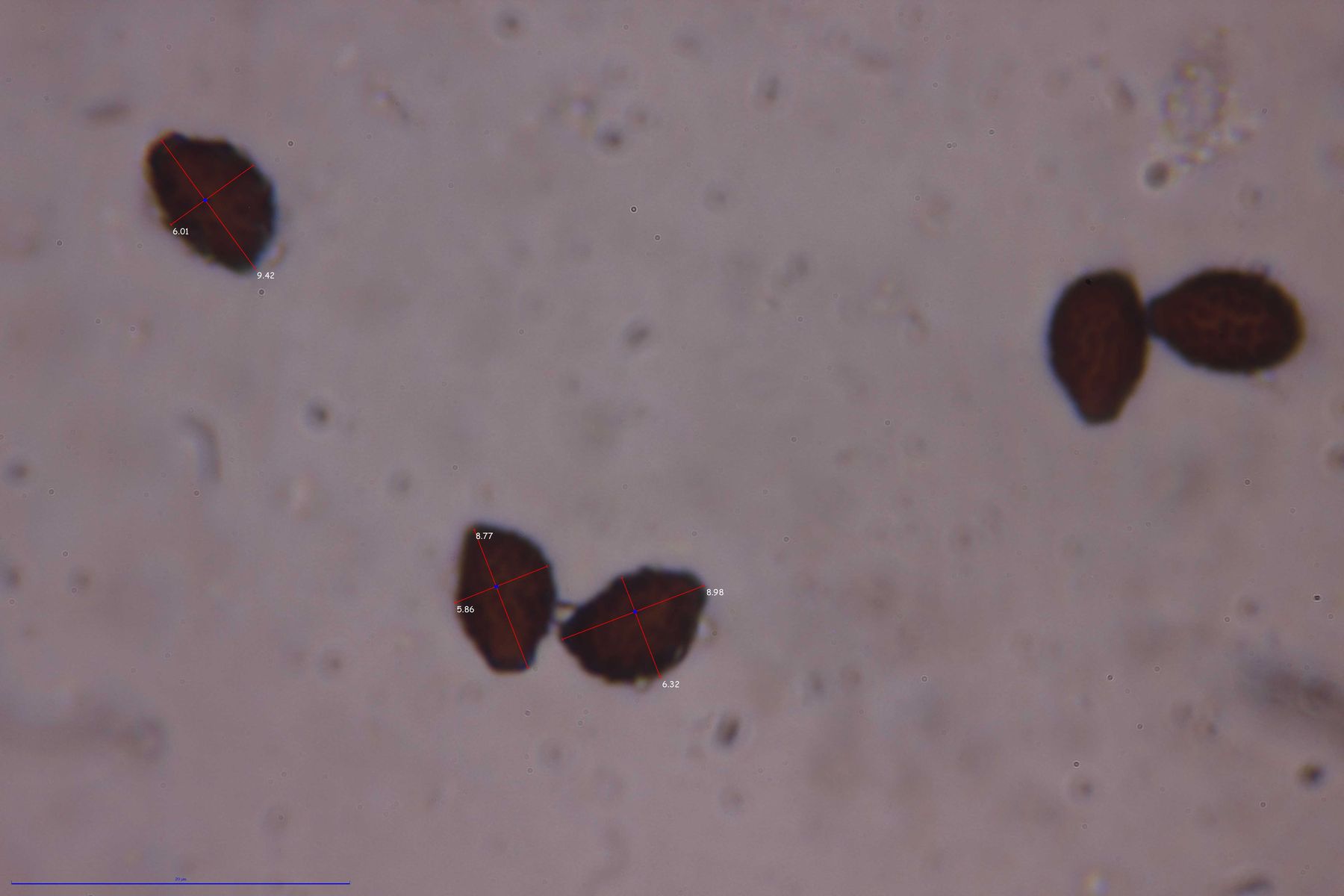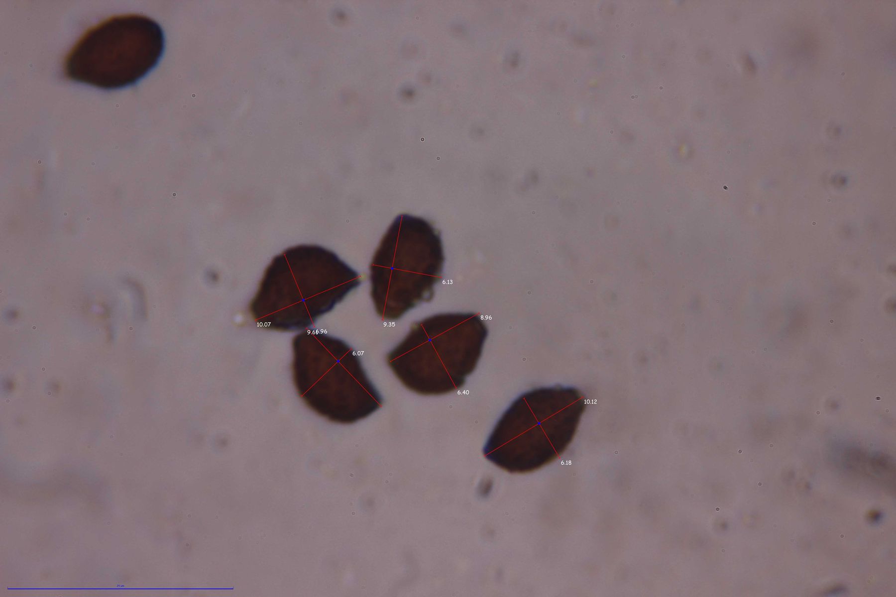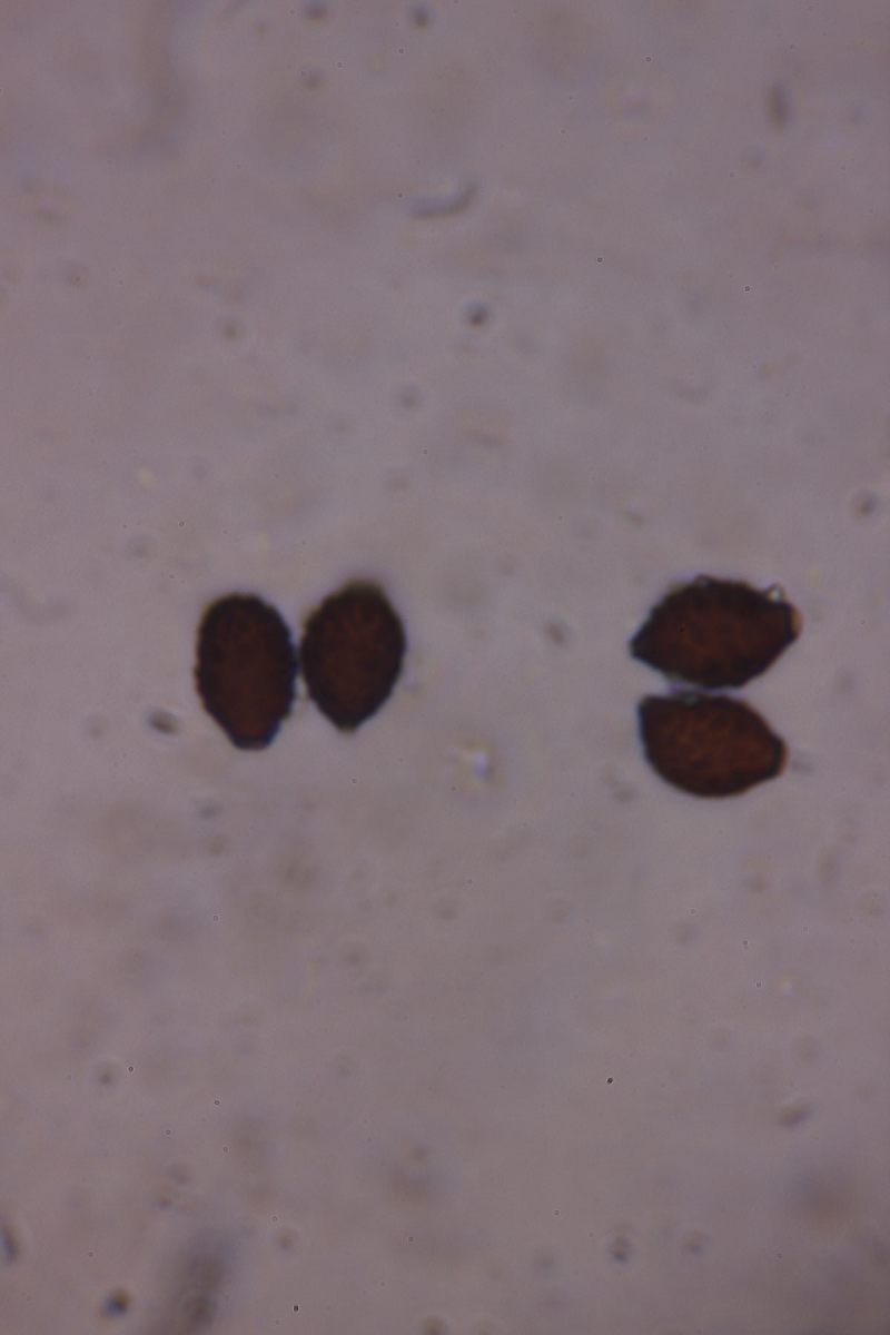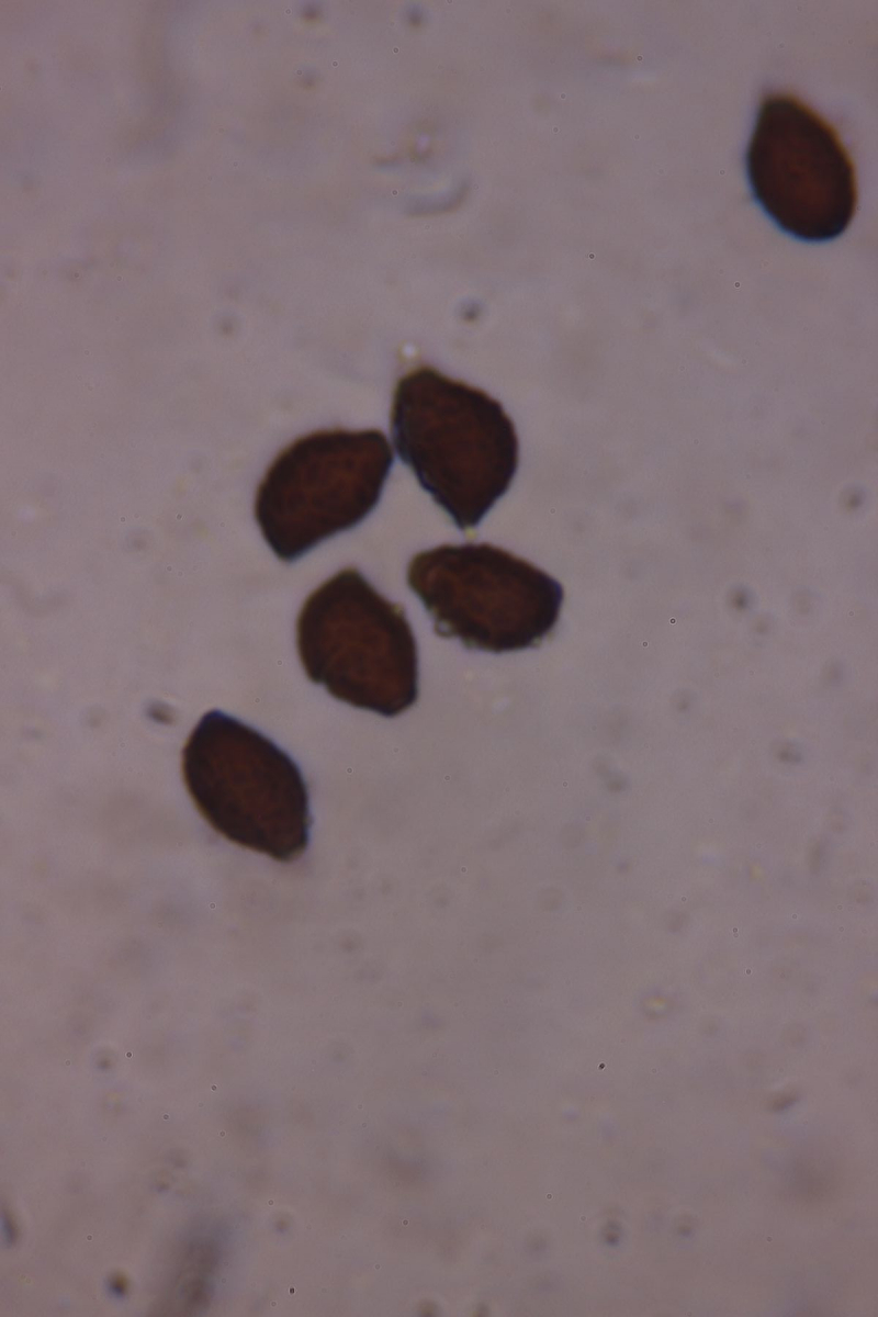Sporen: warzig, dunkelbraun, Maße sollten laut Collins Fungi Guide passen (siehe nachfolgende Tabelle und Bilder)