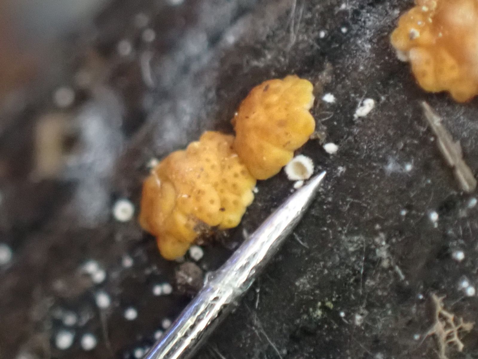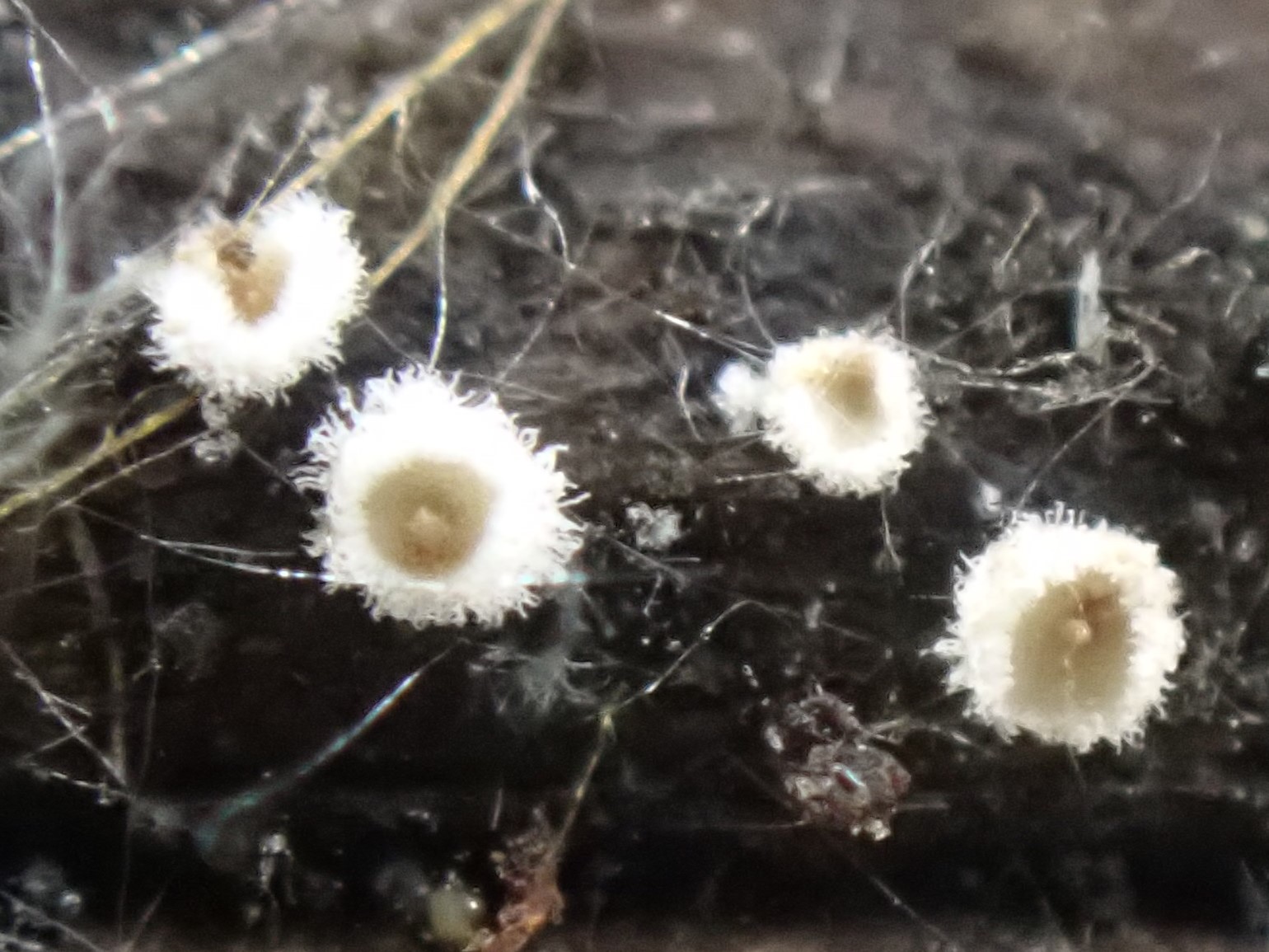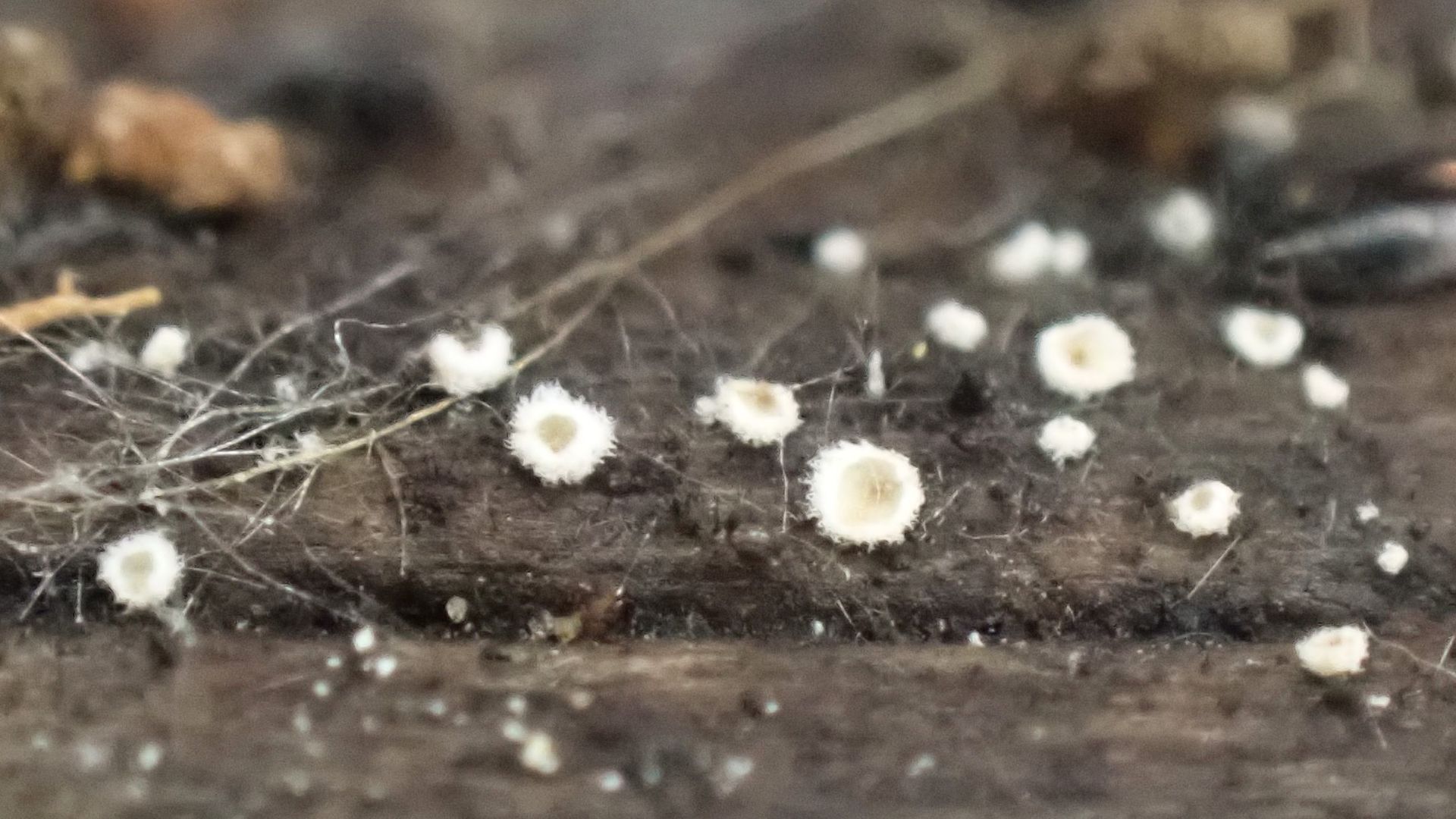 auf einem am Boden liegenden (Laubholz)ästchen wächst dieser winzige Pilz.