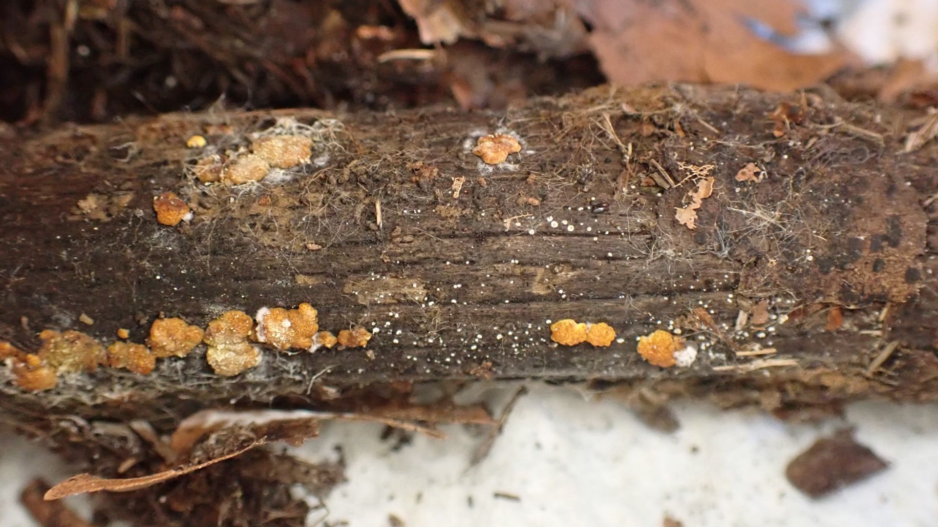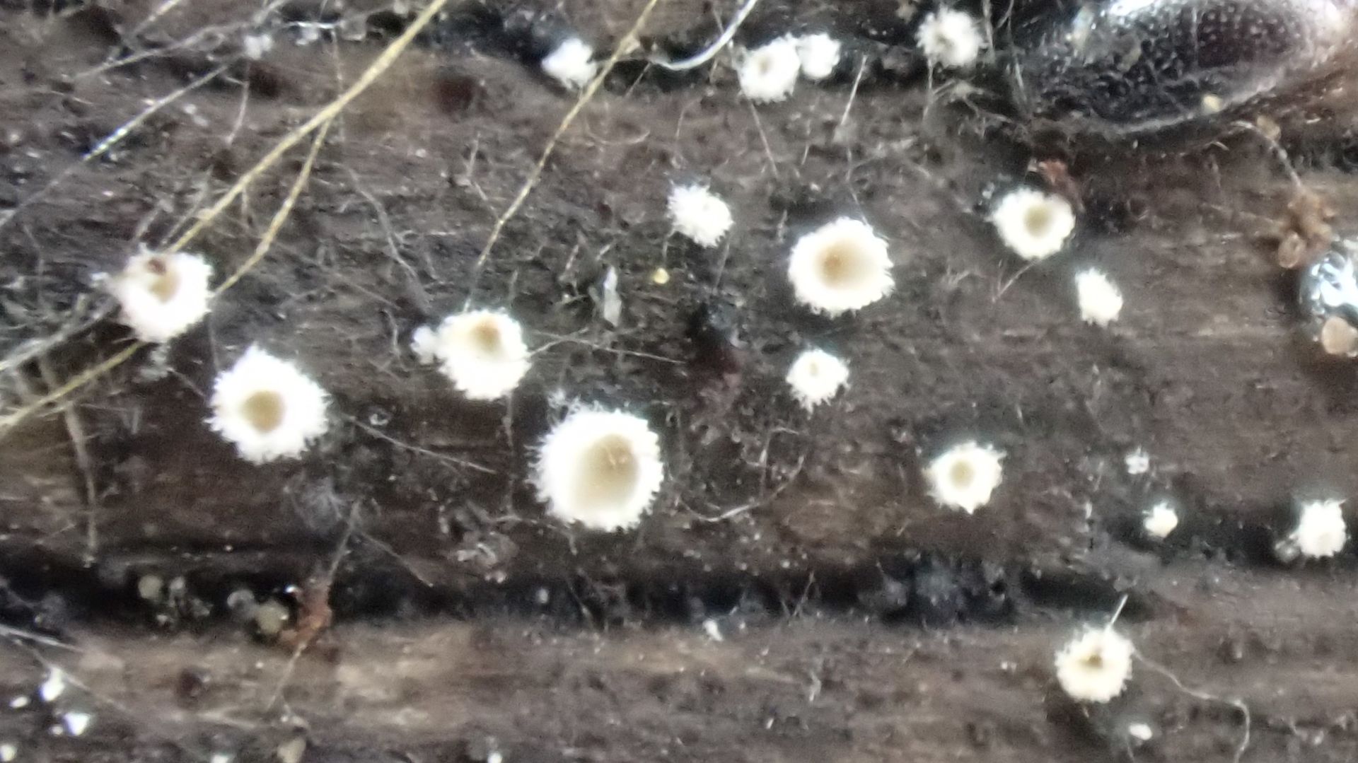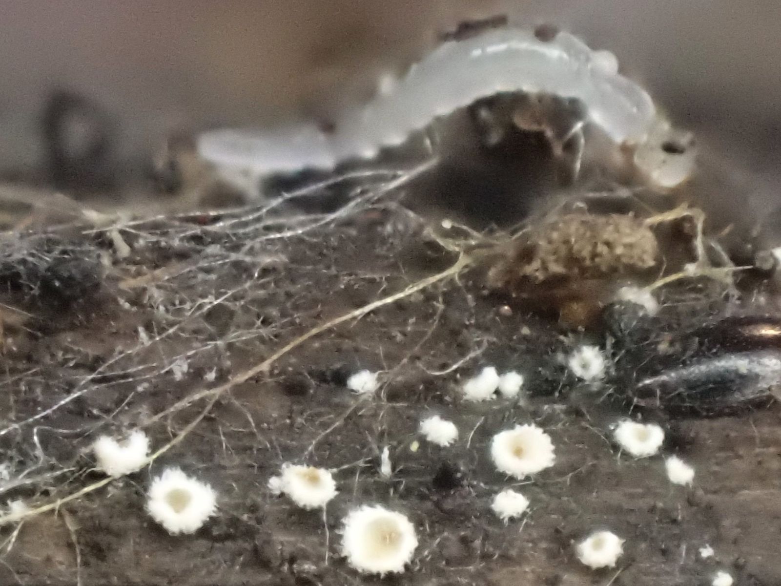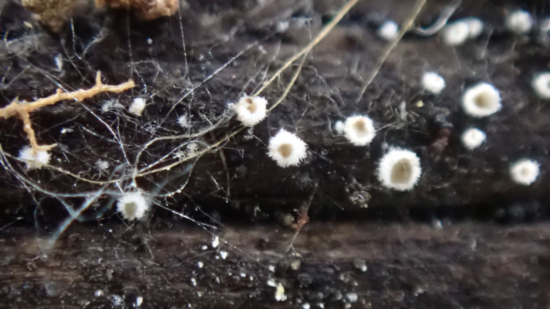 Die von dir gesichteten Nöppelchen halte ich für winzige (Tau)Tröpfchen, die sich an den darüber gespannten Fäden sammeln. Die Fäden sind entweder von kleinen Spinnen oder es sind Hyphen. Bei deinem Fund überziehen die ja reichlich das Substrat.