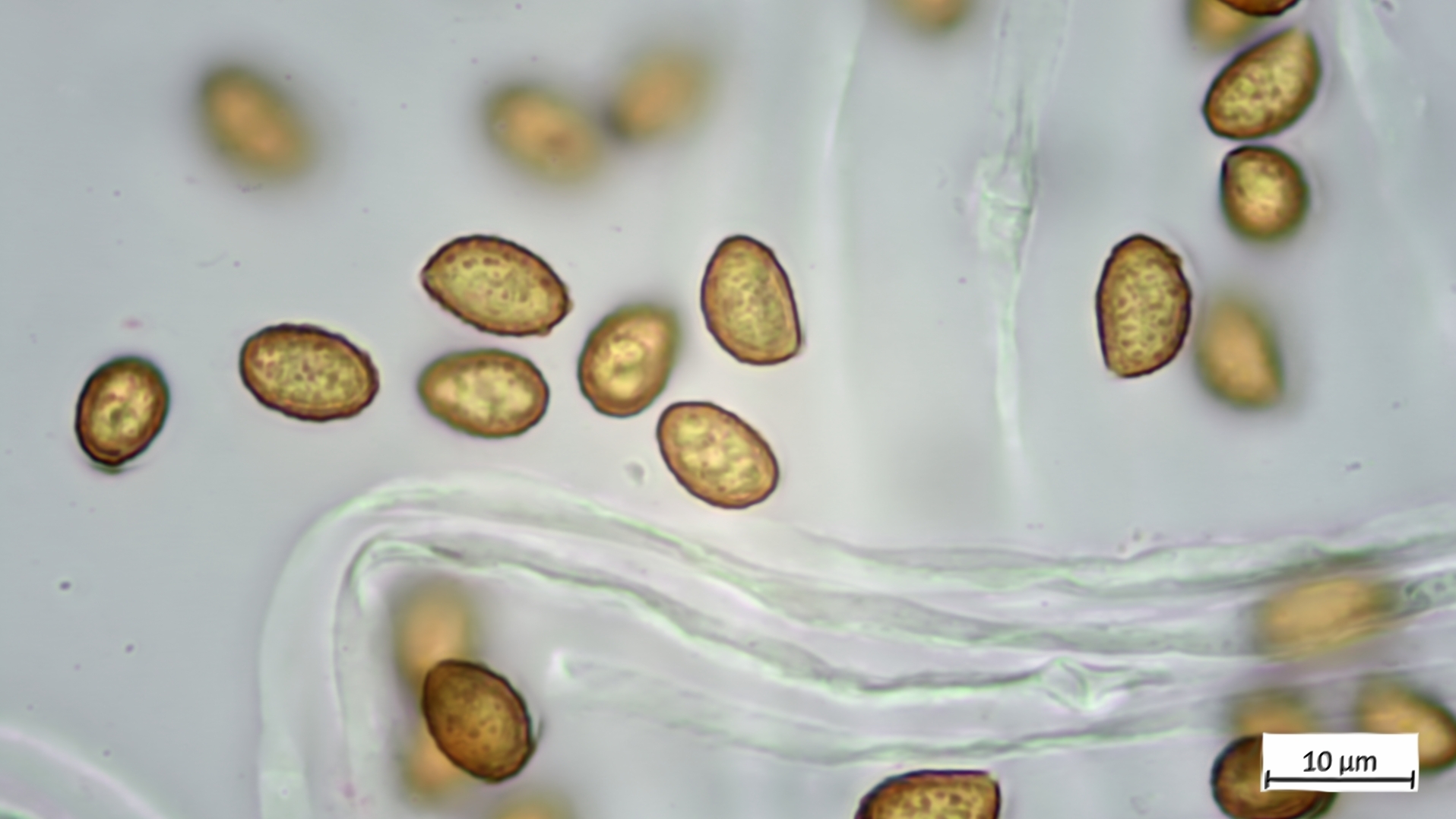 Sporen: 9,7-10,2 µm (av. 10,0 µm, SD 0,2 µm) x 5,6-6,4 µm (av. 6,1 µm, SD 0,3 µm); Q = 1,5-1,8 (av. 1,6, SD 0,1)(n = 7)