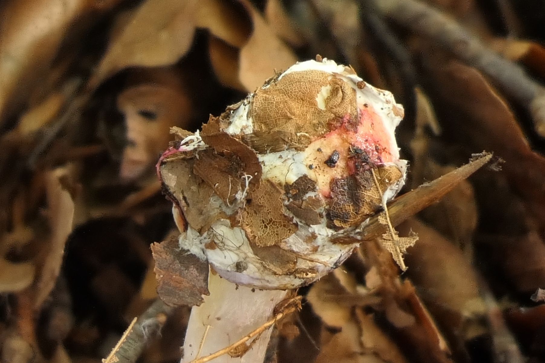 Eine Kontamination kann ich ausschließen. Der Pilz wurde noch direkt am Standort getestet (Messer oder so etwas waren da nicht im Einsatz, halt dasselbe KOH-Fläschen) und zudem konnte die Reaktion des isoliert transportierten Fruchtkörpers auch zu Hause an der anderen Seite reproduziert werden. Dasselbe zarte Rosa, nur an der Knolle.