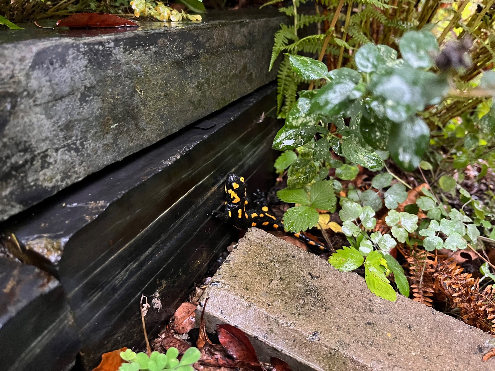 1. Also auf, zur Gassi-Runde bei Salamanderwetter. Einer kroch gleich hinterm Schuppen am Hang hinauf.