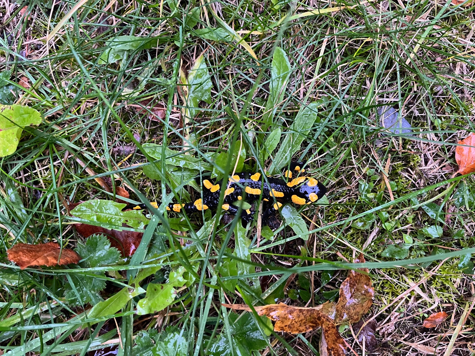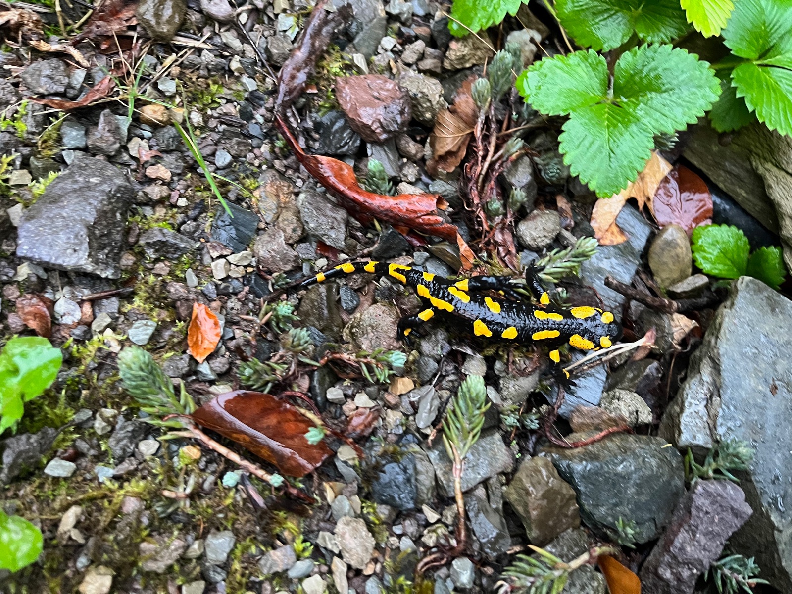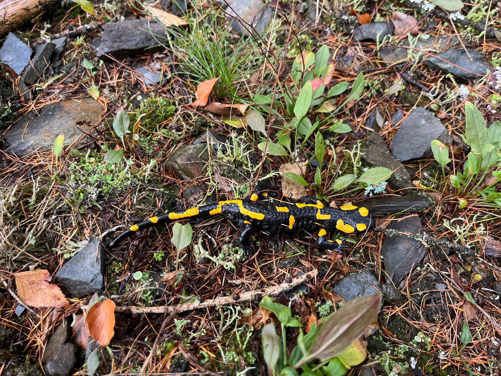 eigentlich gehts hier ja um Pilzexkursionen. Und ich will gleich vorwegschicken: einen Pilz habe ich glücklicherweise nicht gefunden. Den invasiven Salamanderpilz Batrachochytrium salamandrivorans kurz auch Bsal genannt. In der Taz ist ein informativer Beitrag nachzulesen https://taz.de/Feuersalamander-durch-Pilz-bedroht/!5686635/