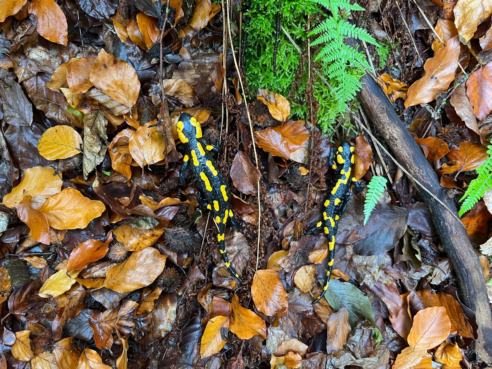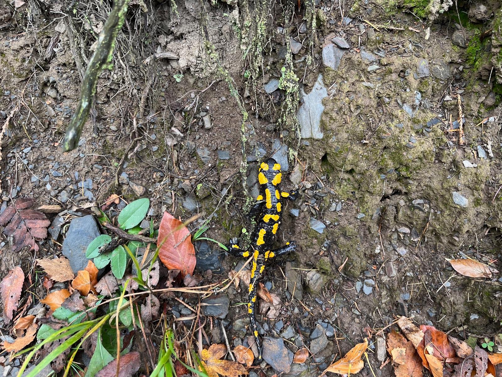 Grandios waren die Unmengen gesunder Feuersalamander. Um diese Zeit sind die immer auf dem Weg von den Bächen in höher gelegene Gebiete und suchen ihre Winterschlafplätze auf. Aber so viele hatte ich hier lange nicht. Keine Sorge, alle habe ich nicht fotografiert. Aber einige mussten schon verewigt werden und ein paar davon zeige ich euch jetzt.