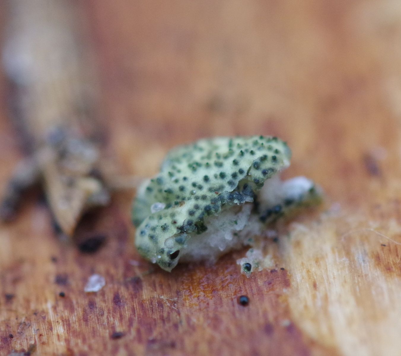 1) ein hellgrünes Etwas mit schwarzen Pünktchen, zum Größenvergleich ein Birkensame auf Bild 1, der "Schnitt" erfolgte mit dem Fingernagel, sehr weich. Oder könnne Pyros so aussehen?
