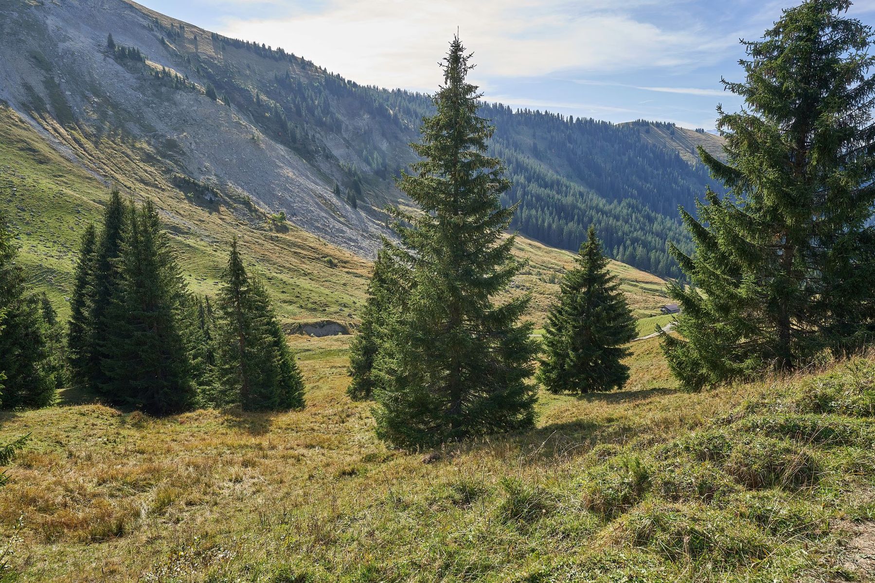 Zirka 2 m hinter meinem Fotostandort zur Ablichtung der Schirmpilze vor dem Augstmatthorn stand eine Dreiergruppe kräftiger Steinpilze, die danach meine volle fotografische Zuwendung erhielten. Die dunkle Stielfärbung finde ich ungewöhnlich, aber was soll es anderes sein als B. edulis? In der Nähe wuchsen Fichten, wo weitere Steinpilze standen, allerdings schattig.