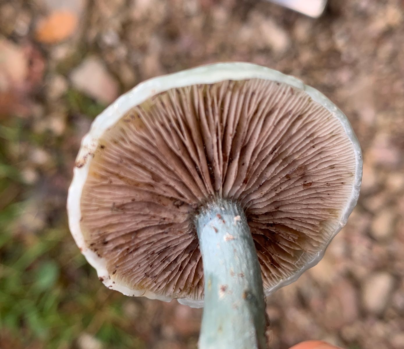 S. caerulea hat im Gegensatz zu S. aeruginosa keine weissflockigen Lamellenschneiden.