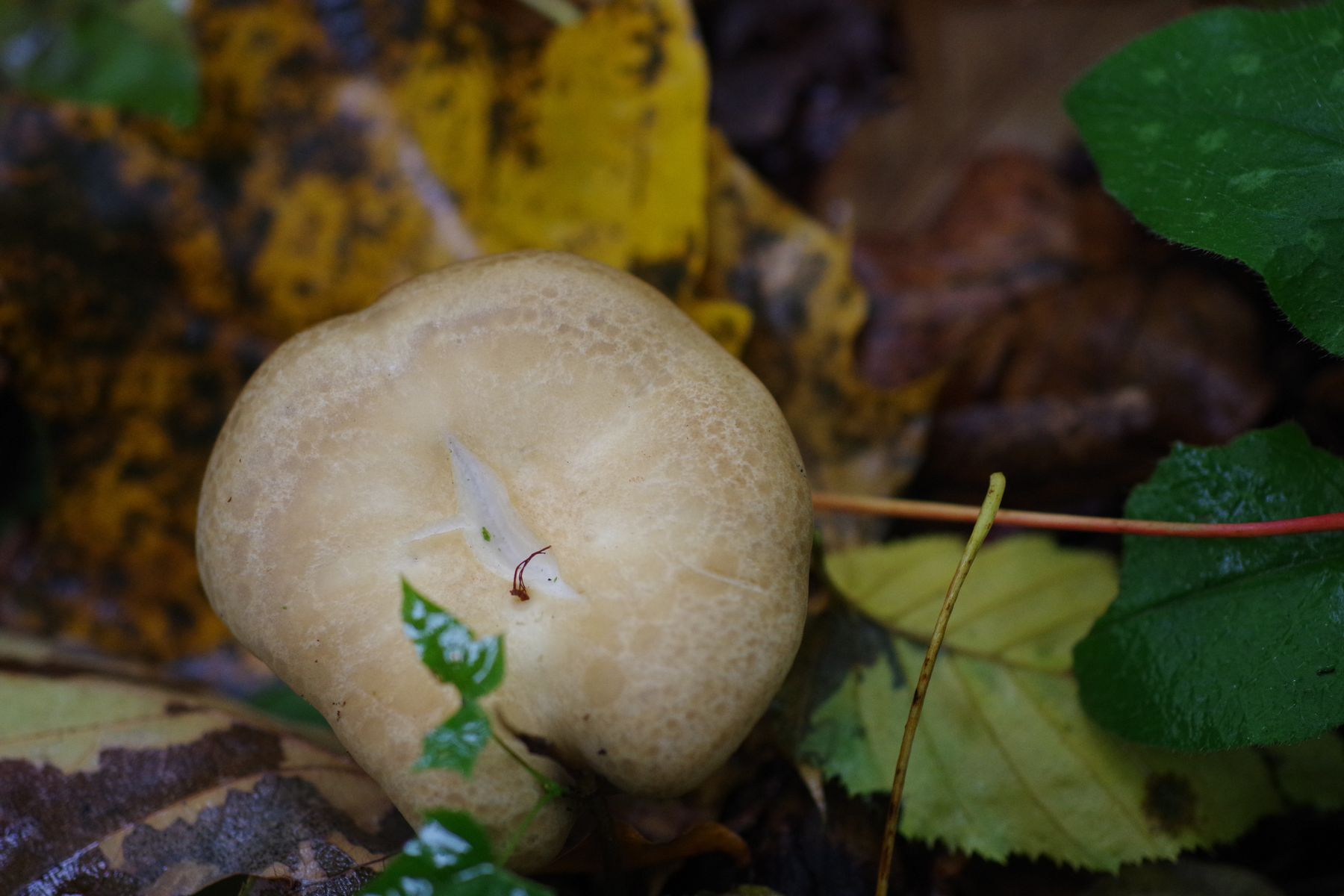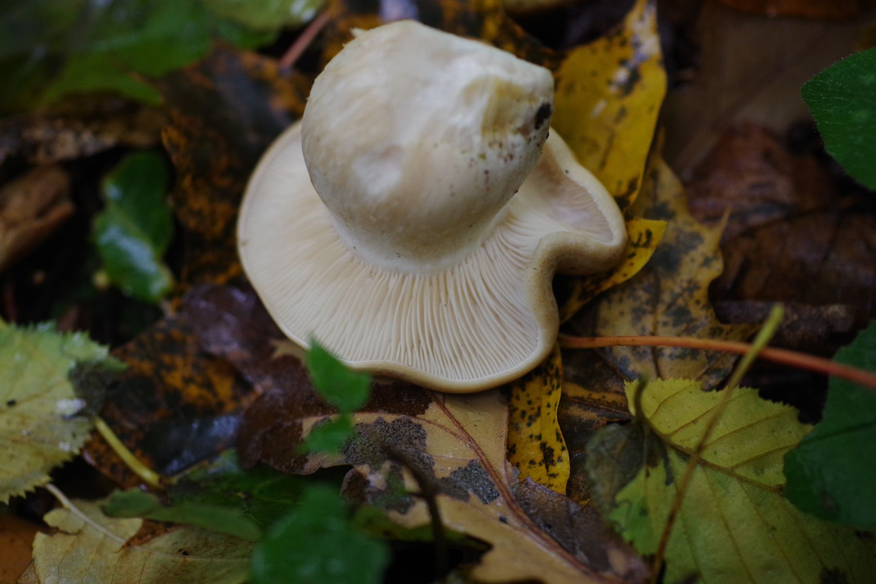 An einer verletzten Hainbuche im Hanglaubwald wächst dieser Lamellenpilz in gut 2 m Höhe, der mit dem knolligen Stiel (bis 3,5 cm dick) so aussieht, als hätte er sehr groß werden wollen. Leider ein Einzelstück. Geruch unangenehm, so ähnlich wie beim Mairitterling. Geschmack nicht getestet. Hut und Stiel im Schnitt weiß. Ein Stück habe ich zum Absporen ausgelegt, vielleicht geht das ja schon. Keine Flocken, Ringe oder Schuppen am Stiel, nur etwas Muster auf dem Hut. Ich tappe im Dunklen und bin für Hinweise und Vorschläge dankbar.