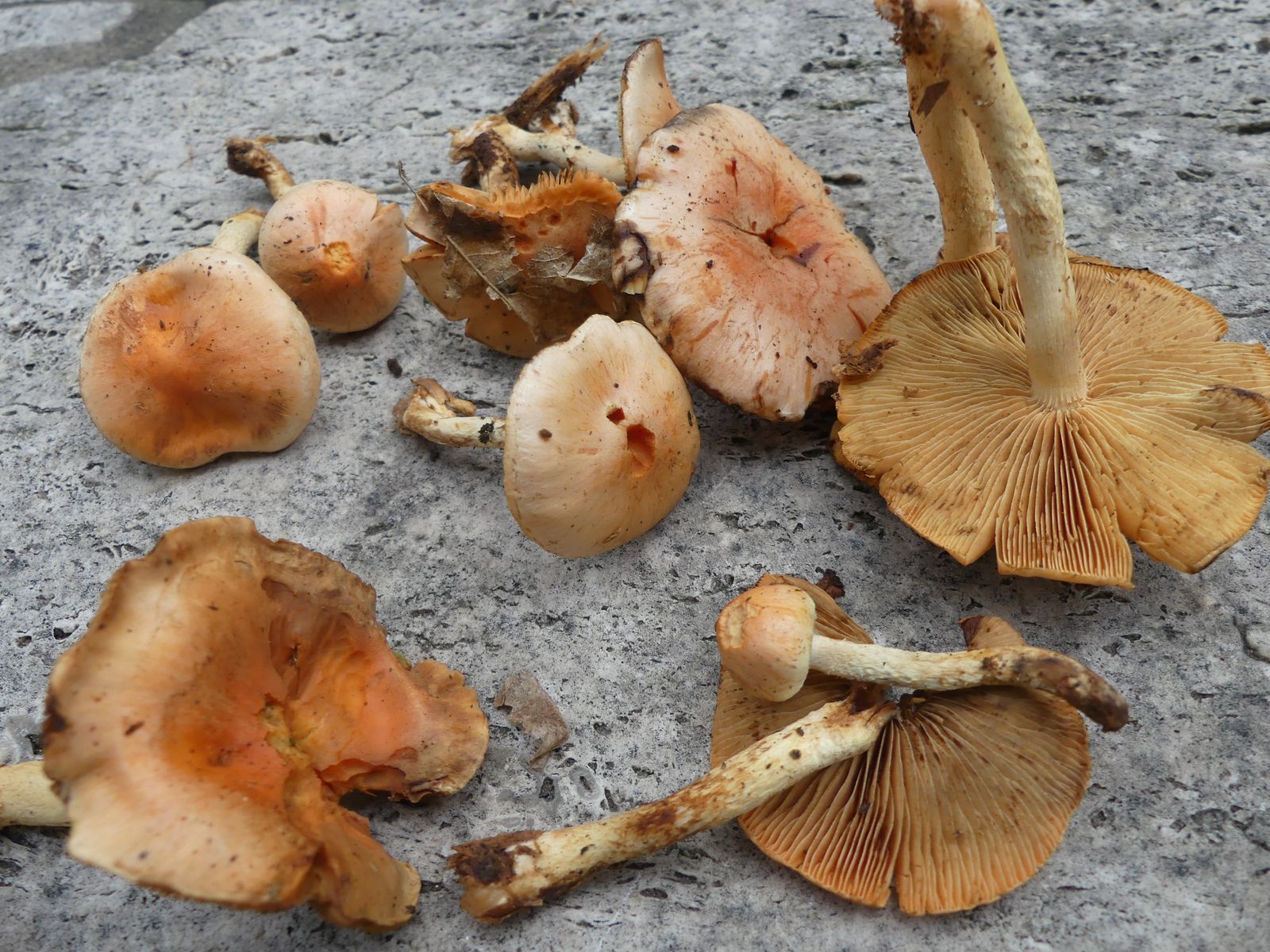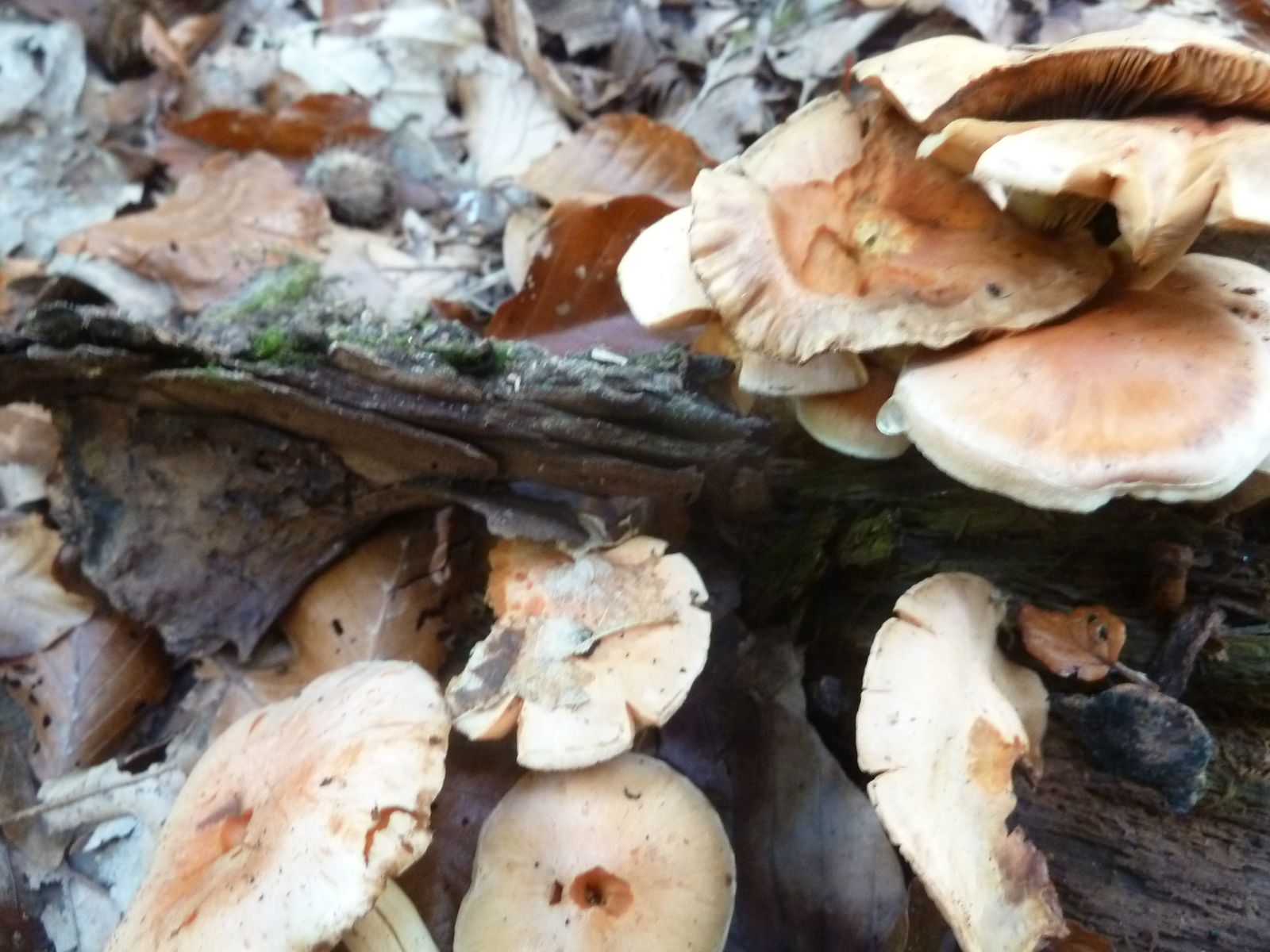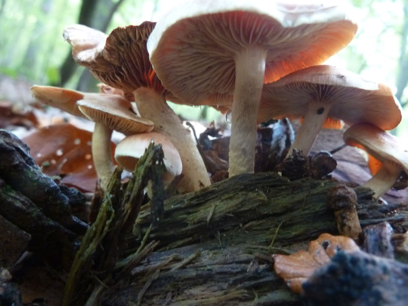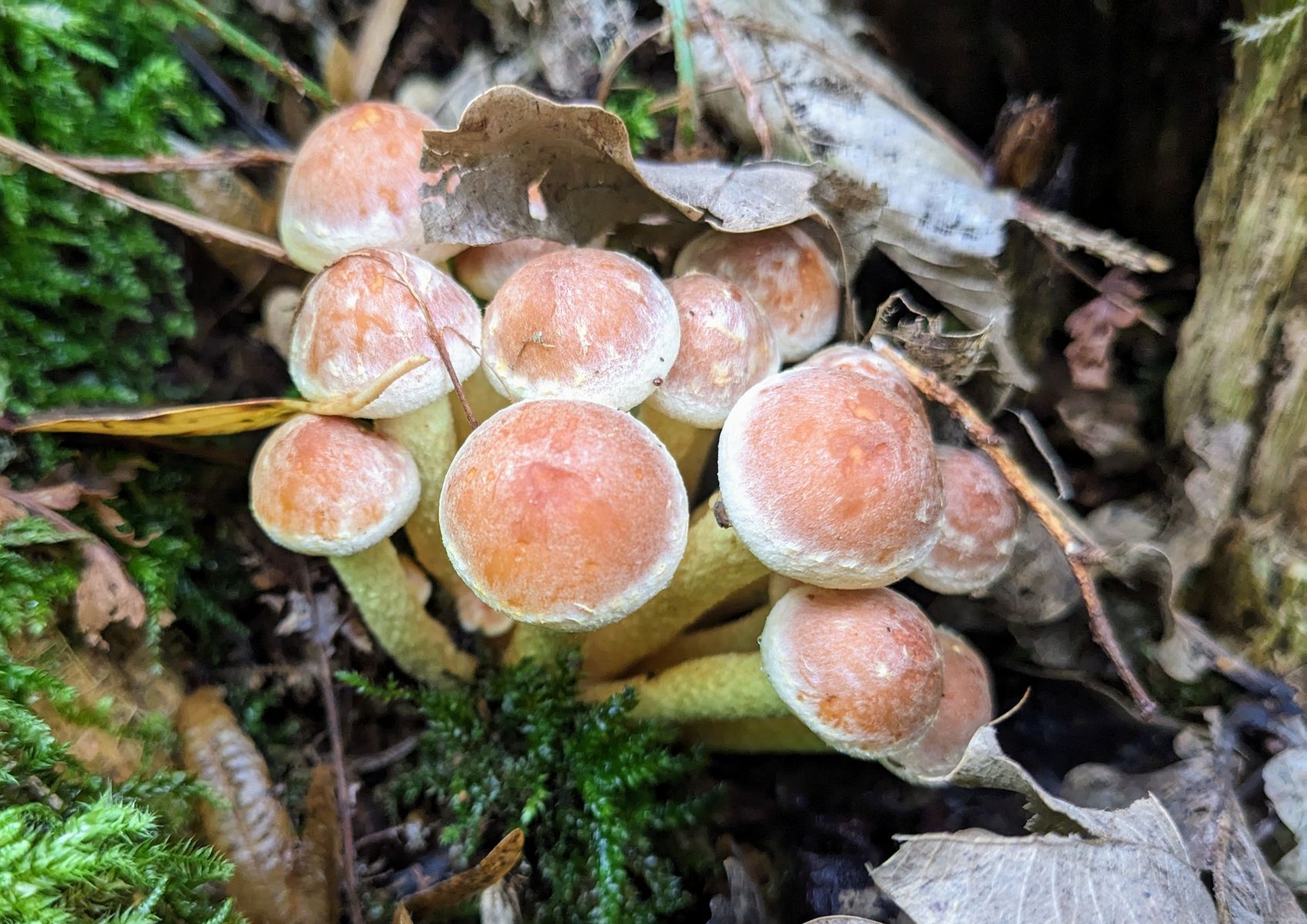 Heute habe ich in den Ausläufern von einem stark vermulmten Nadelholzstubben (vermutlich Kiefer oder Lärche) diese "Schwefelköpfe" gefunden, deren wahre Identität sich mir nicht erschließt. Normale Ziegelrote Schwefelköpfe habe ich ebenfalls gefunden, das hier sieht aber anders aus. Schon die Hutfarbe mit dem lachsrosa Einschlag ist ungewöhnlich, so kenne ich das vom Ziegelroten nicht. Die Ziegelroten kenne ich auch als eher kräftige Fruchtkörper mit ziemlich dickfleischigem Hut, diese Exemplare sind recht dünnfleischig.