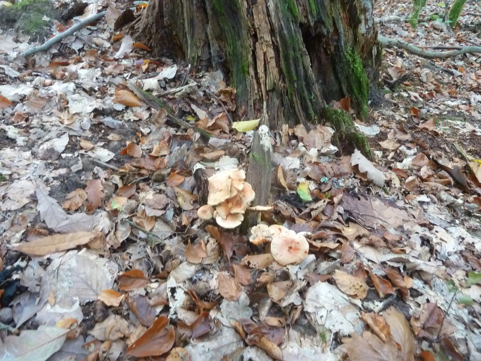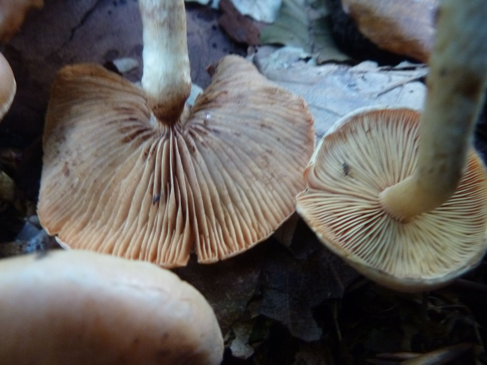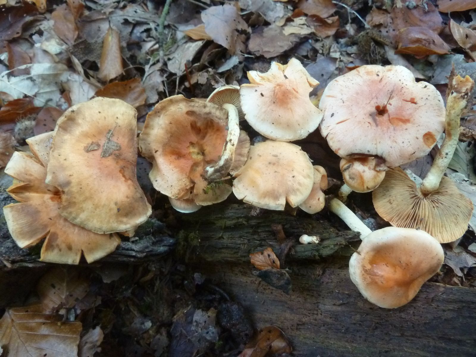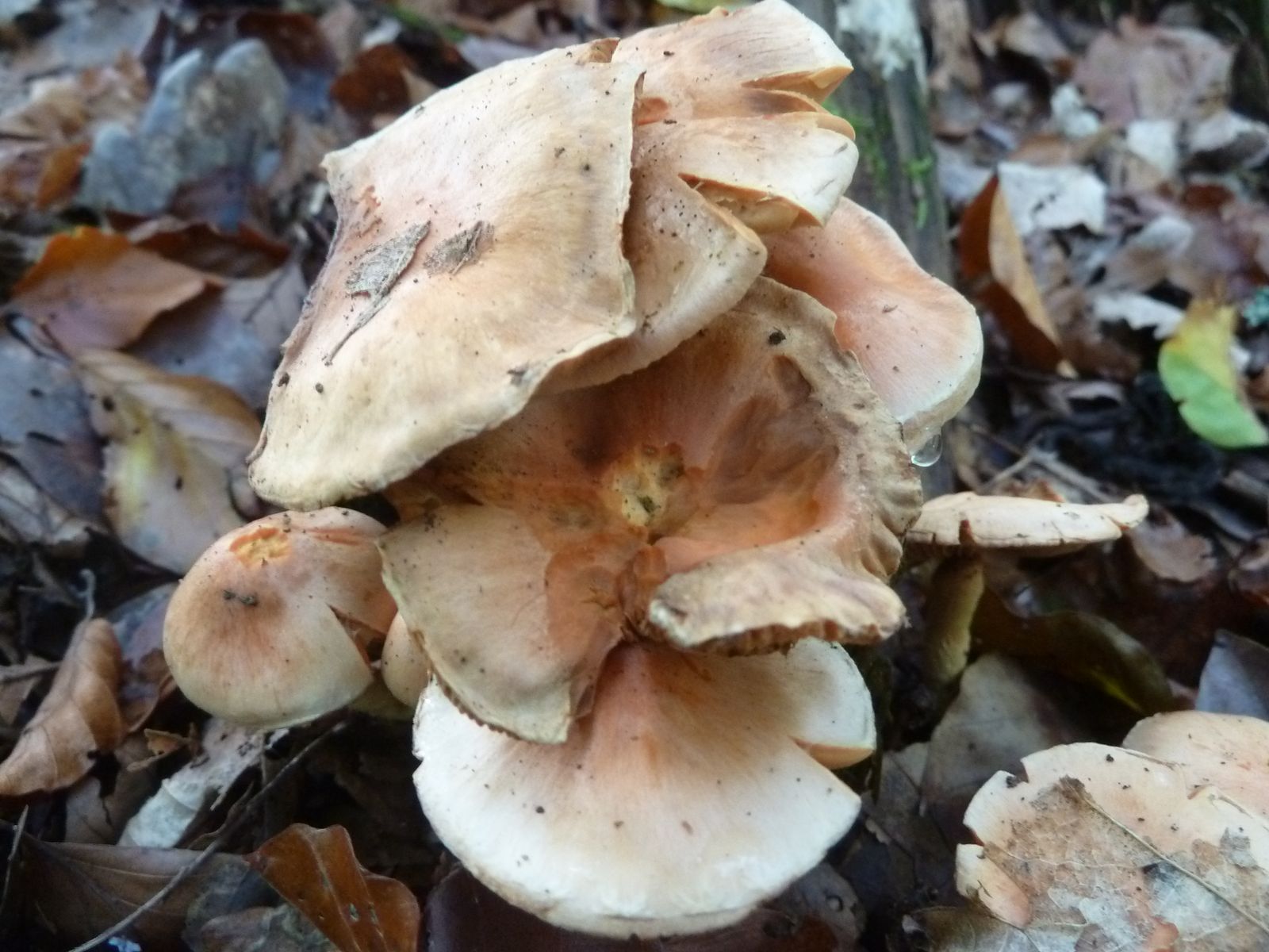 Heute habe ich in den Ausläufern von einem stark vermulmten Nadelholzstubben (vermutlich Kiefer oder Lärche) diese "Schwefelköpfe" gefunden, deren wahre Identität sich mir nicht erschließt. Normale Ziegelrote Schwefelköpfe habe ich ebenfalls gefunden, das hier sieht aber anders aus. Schon die Hutfarbe mit dem lachsrosa Einschlag ist ungewöhnlich, so kenne ich das vom Ziegelroten nicht. Die Ziegelroten kenne ich auch als eher kräftige Fruchtkörper mit ziemlich dickfleischigem Hut, diese Exemplare sind recht dünnfleischig.