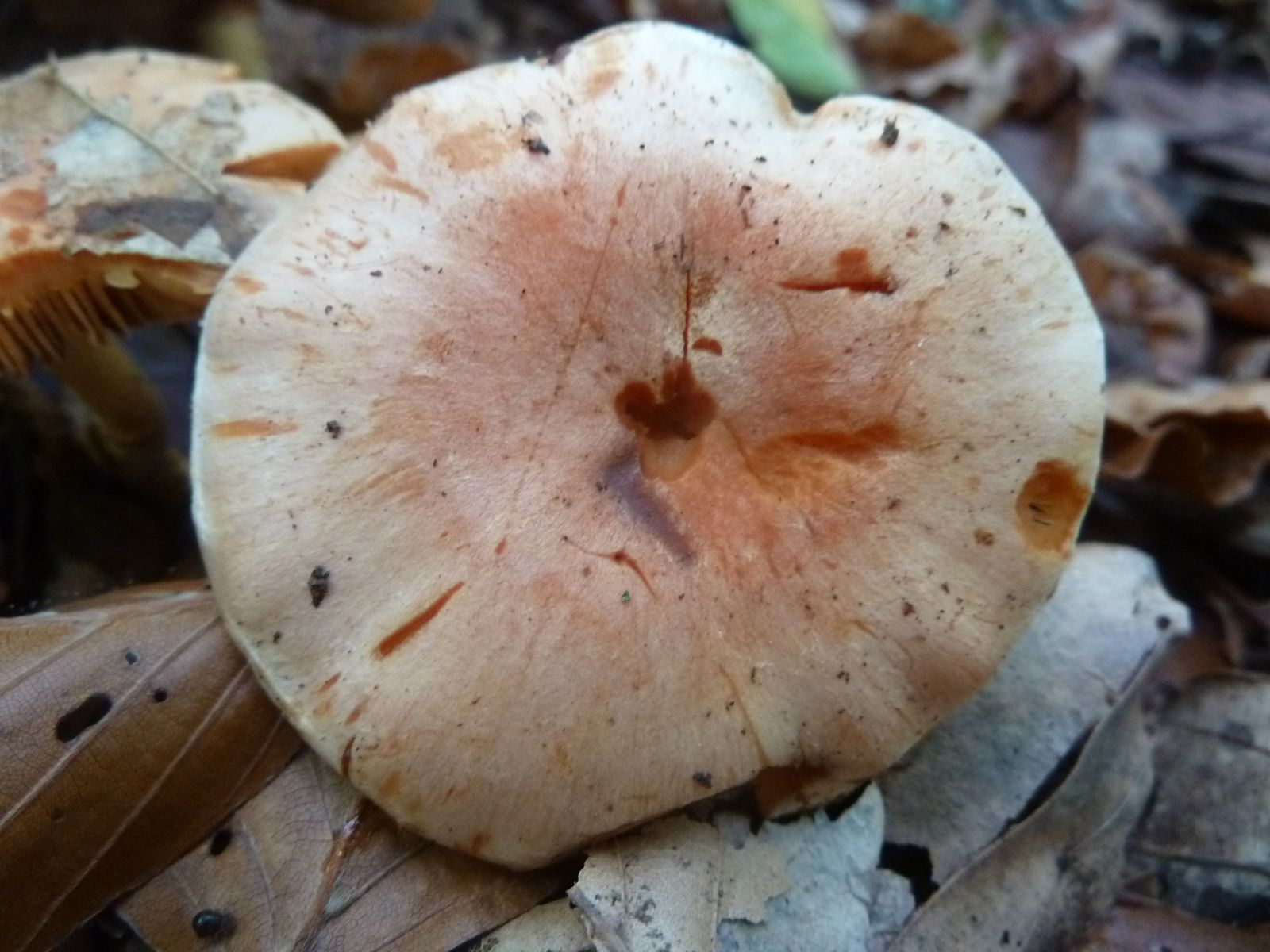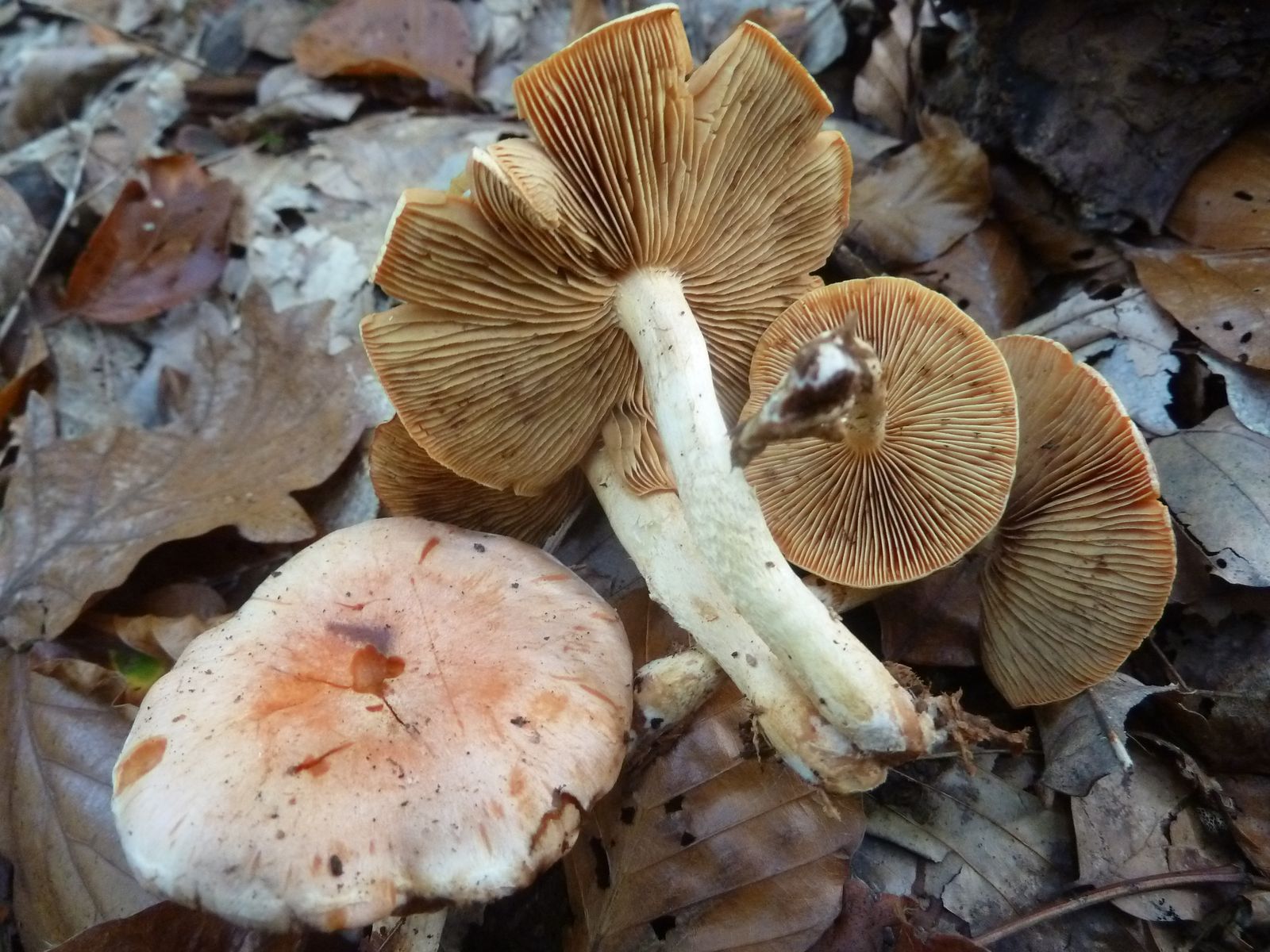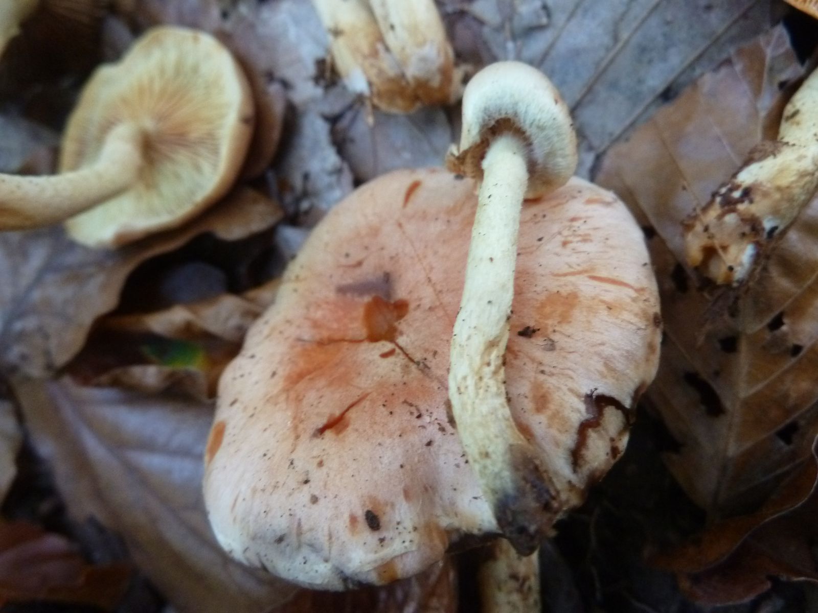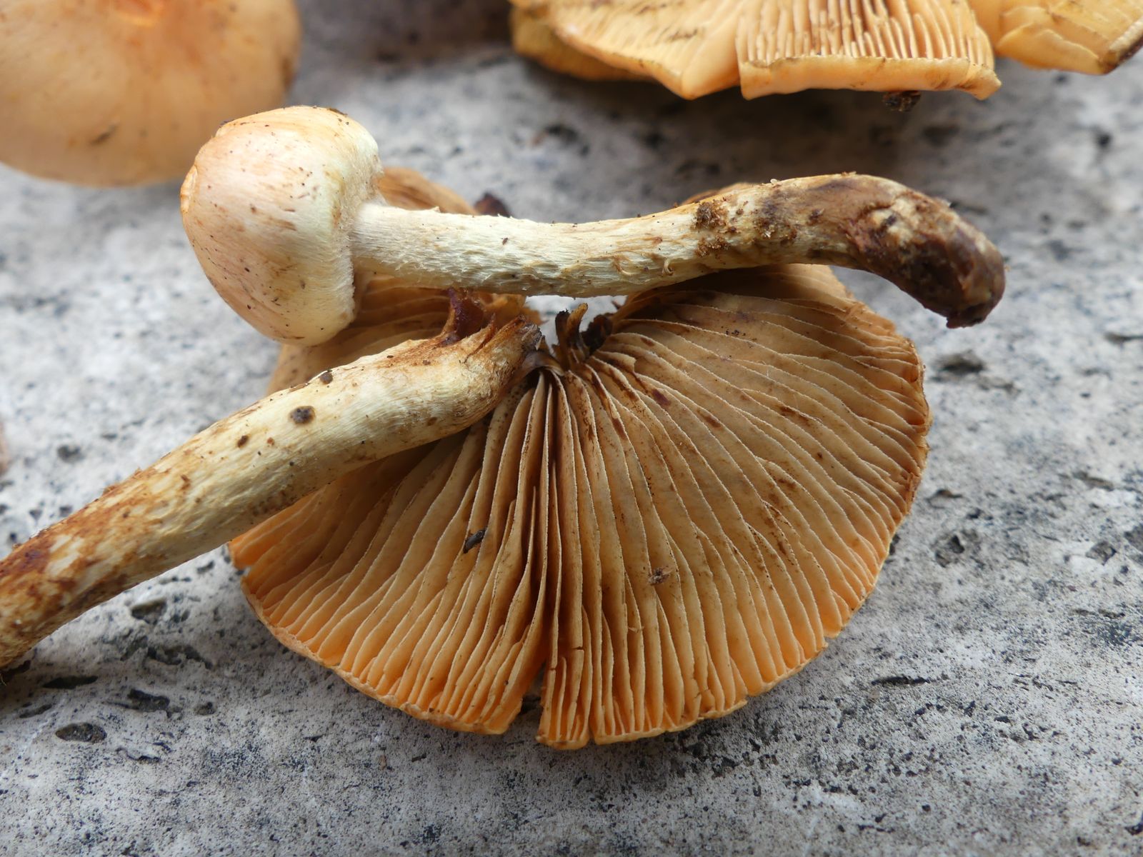Heute habe ich in den Ausläufern von einem stark vermulmten Nadelholzstubben (vermutlich Kiefer oder Lärche) diese "Schwefelköpfe" gefunden, deren wahre Identität sich mir nicht erschließt. Normale Ziegelrote Schwefelköpfe habe ich ebenfalls gefunden, das hier sieht aber anders aus. Schon die Hutfarbe mit dem lachsrosa Einschlag ist ungewöhnlich, so kenne ich das vom Ziegelroten nicht. Die Ziegelroten kenne ich auch als eher kräftige Fruchtkörper mit ziemlich dickfleischigem Hut, diese Exemplare sind recht dünnfleischig.