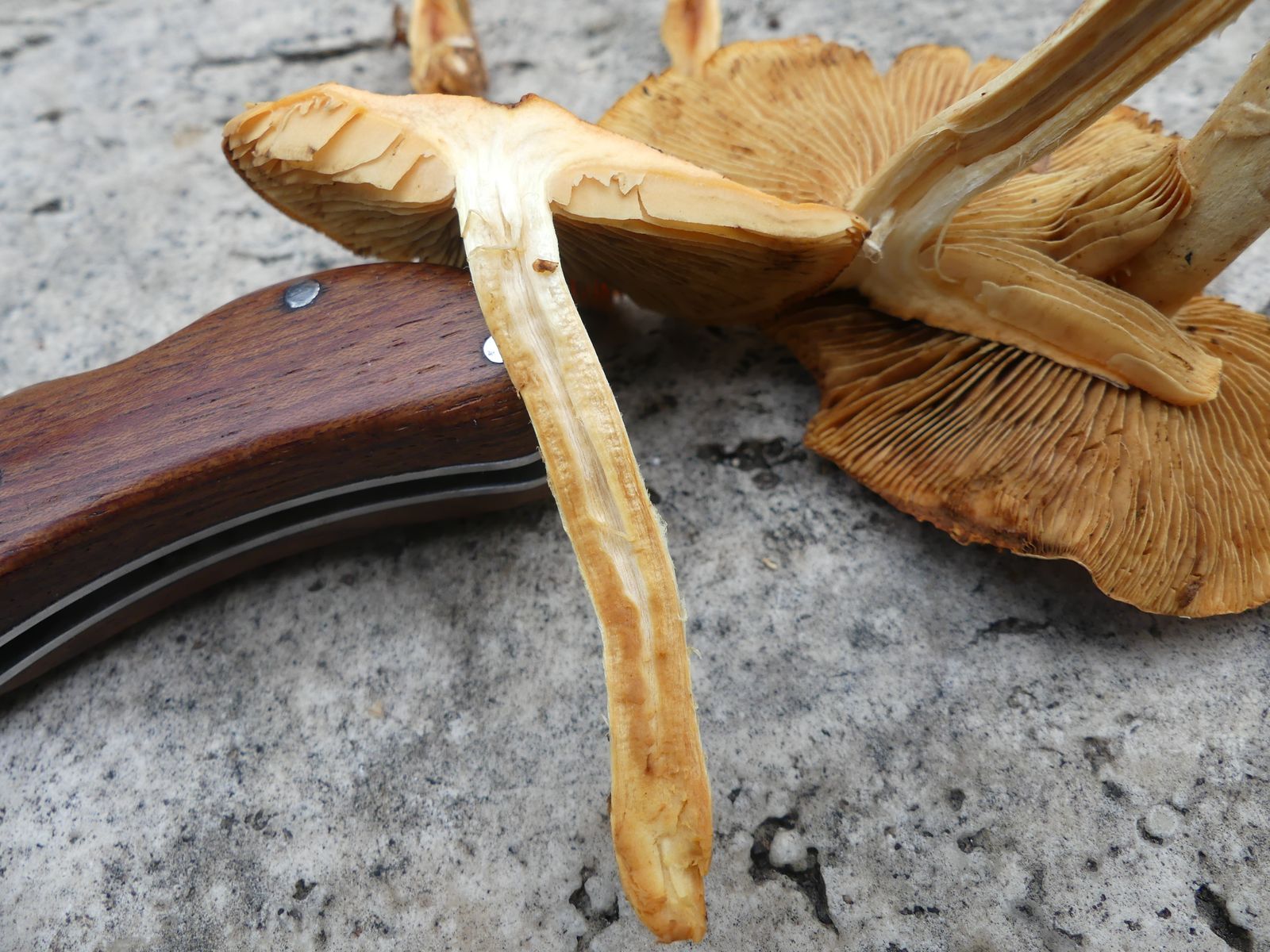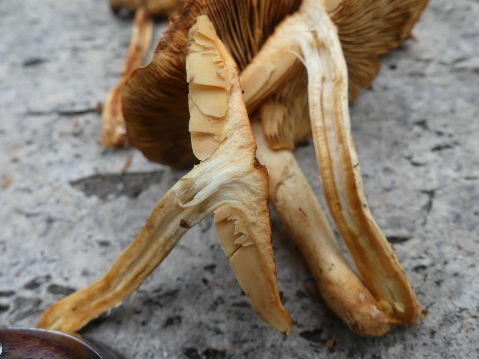 Stiele hohl, zur Basis hin ist das Stielfleisch orangebraun. Hutfleisch recht dünn.
