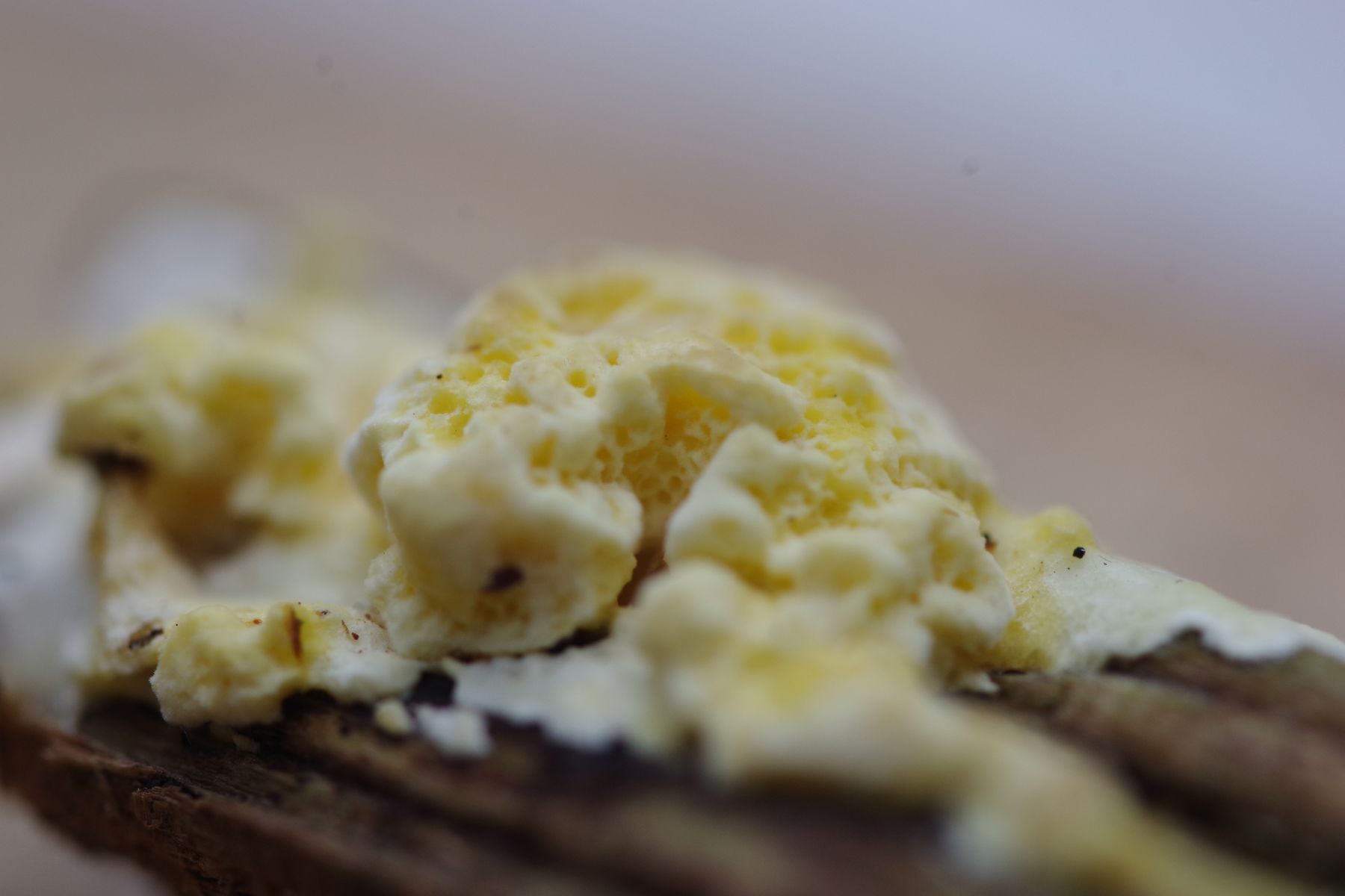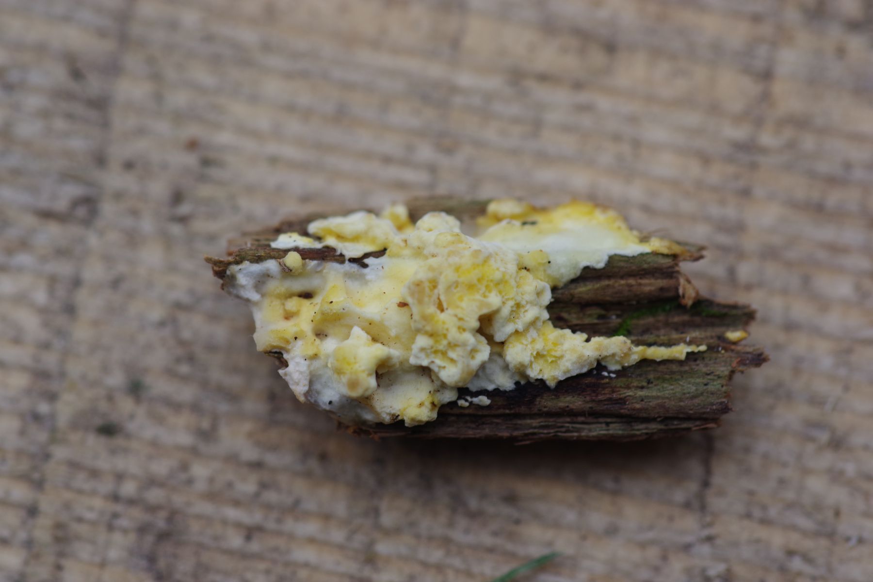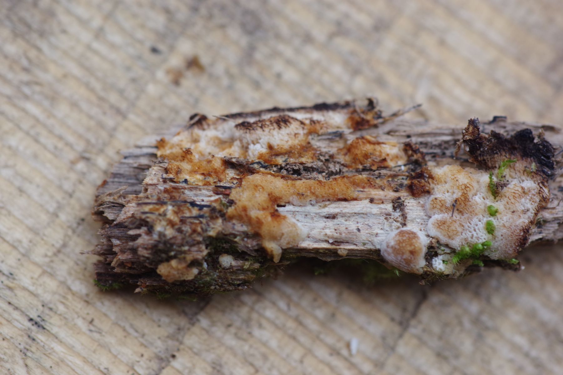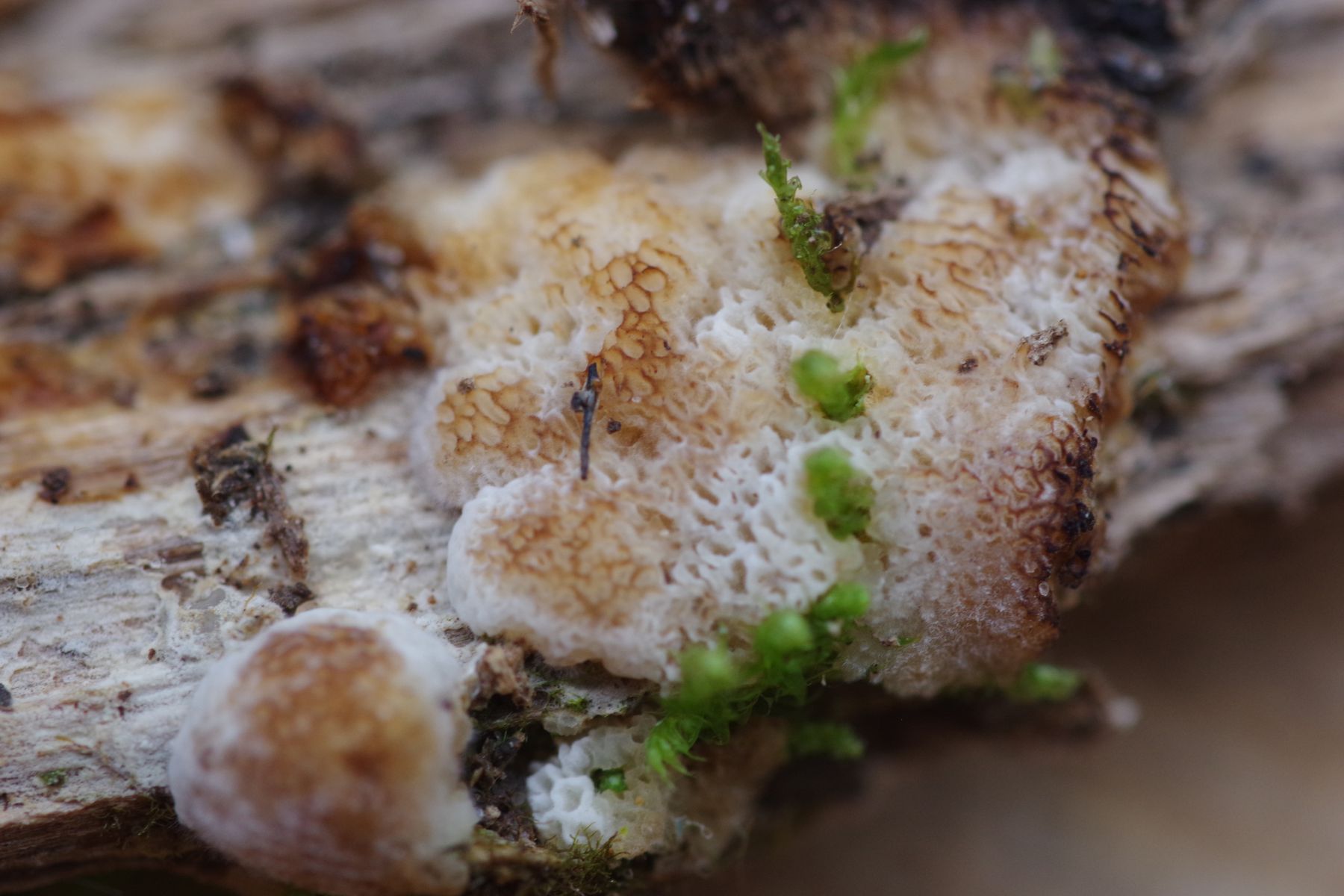 2) eine gelb-weiße Antrodia s.l. an ziemlich dicker liegender Fichte, die ich für Antrodiella citrinella halte. Von den Farben her käme noch Antrodia xantha in Betracht, die verknubbelt aber nicht so