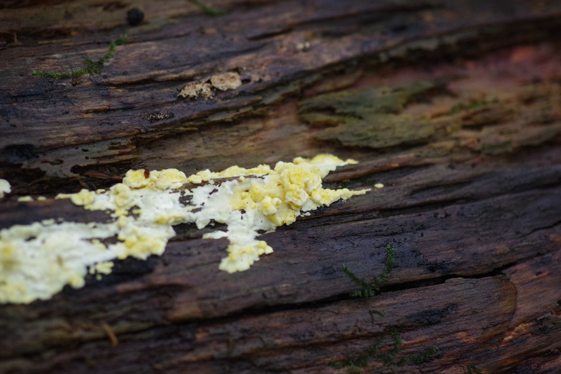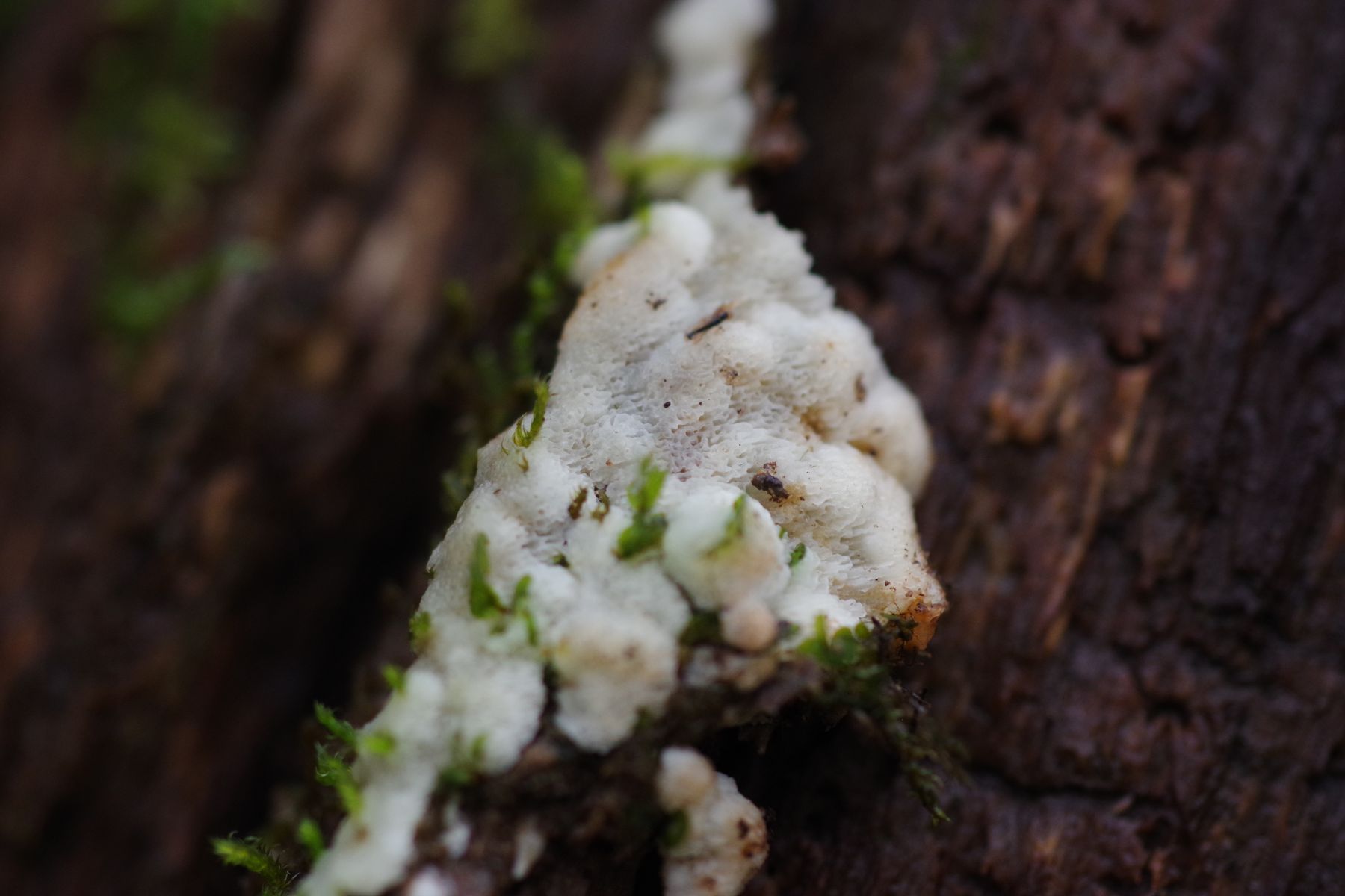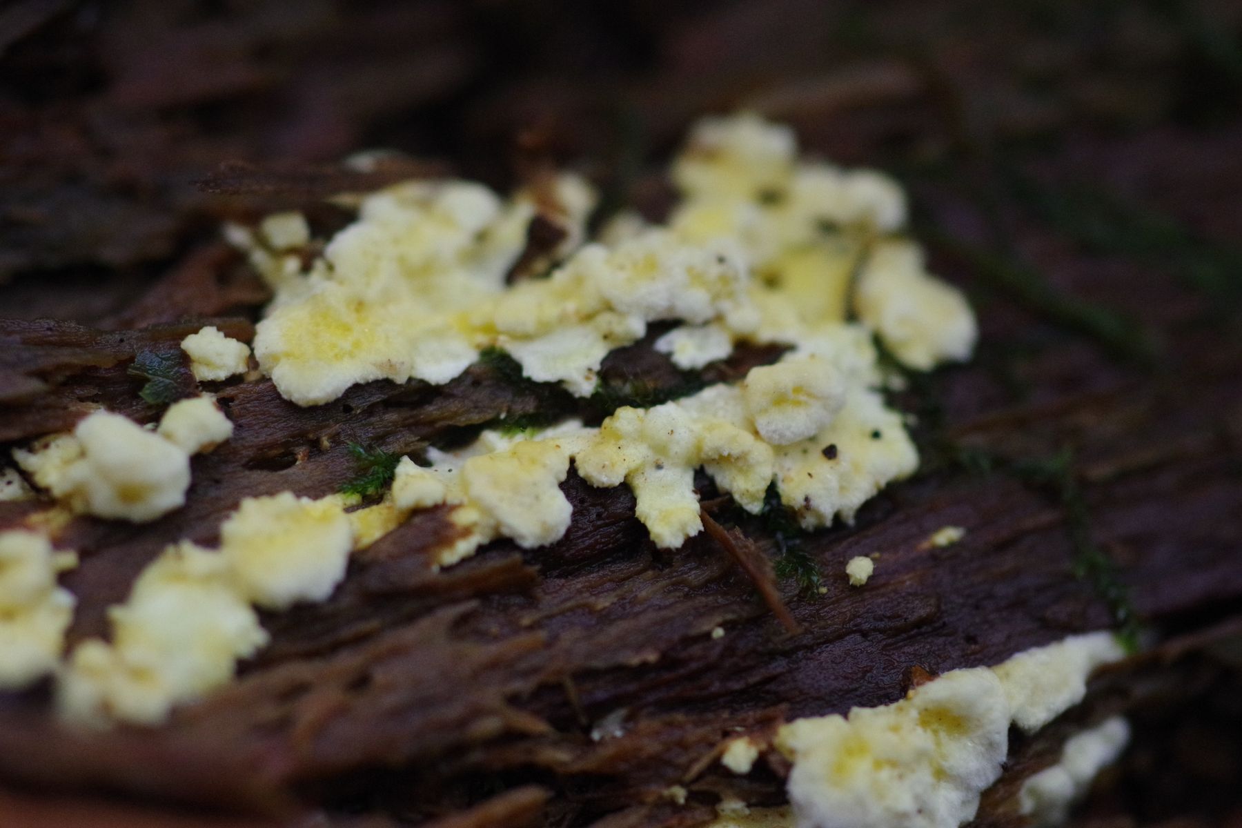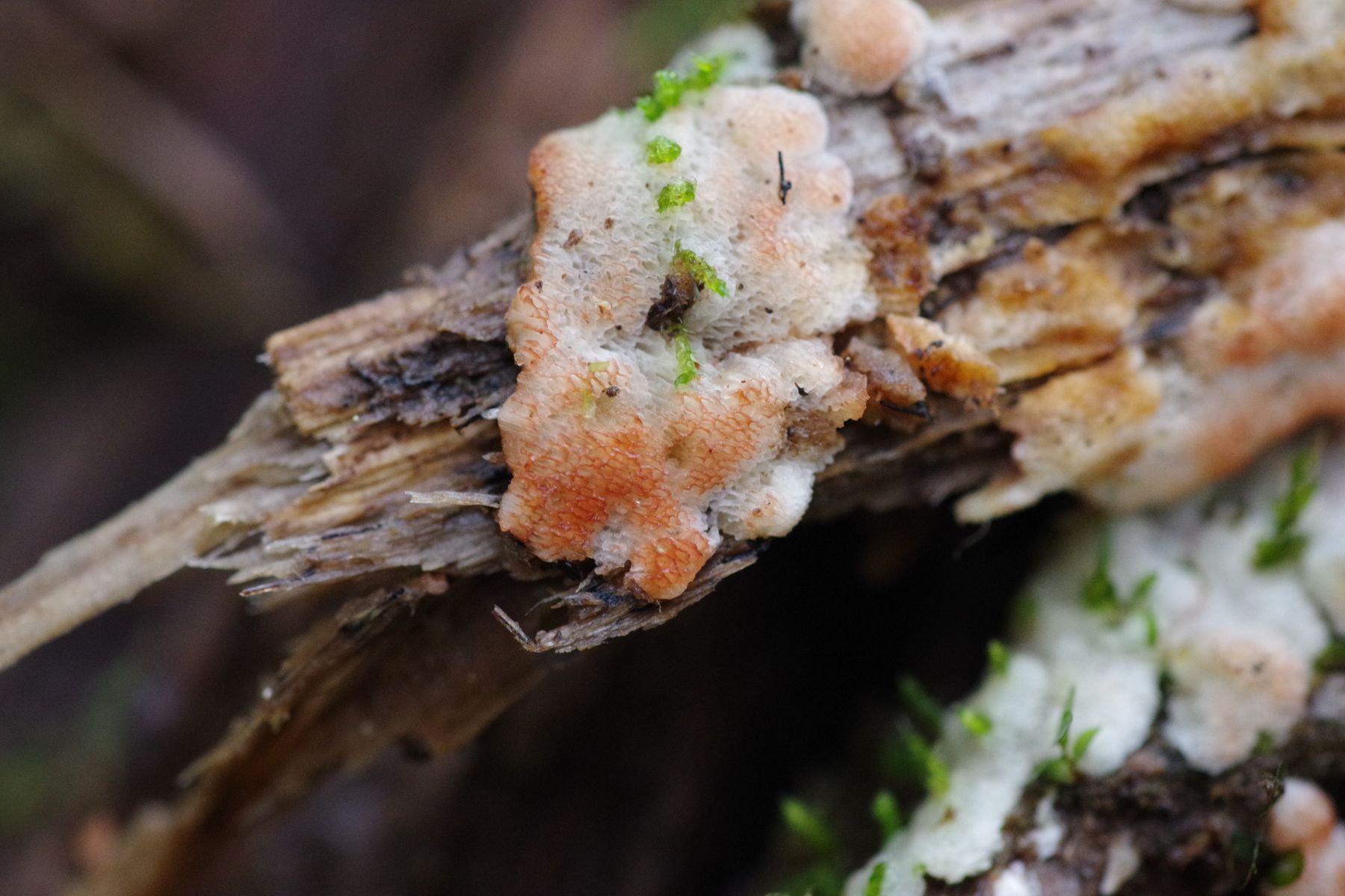 2) eine gelb-weiße Antrodia s.l. an ziemlich dicker liegender Fichte, die ich für Antrodiella citrinella halte. Von den Farben her käme noch Antrodia xantha in Betracht, die verknubbelt aber nicht so