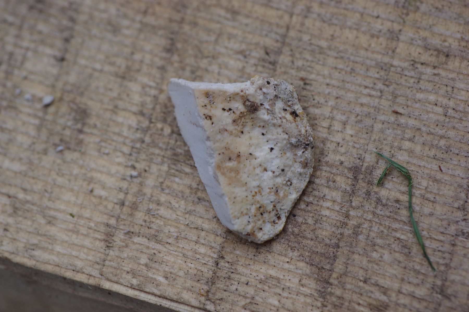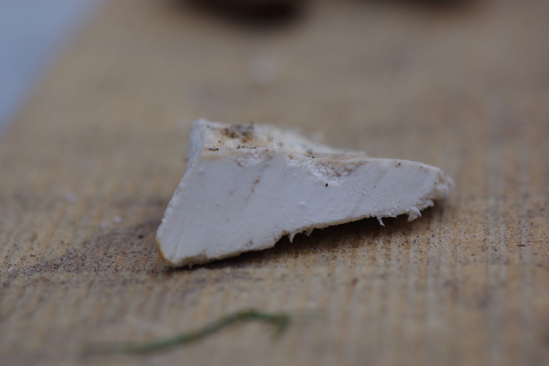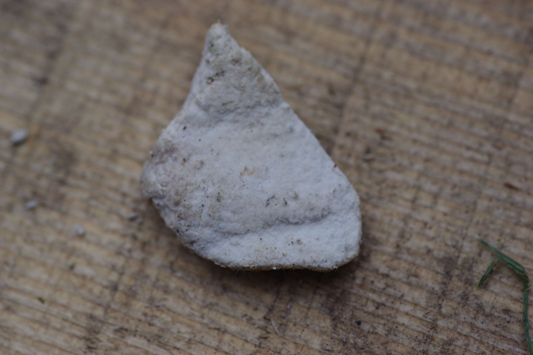 3) ein Saftporling an relativ dünner, liegender Eiche, bei dem ich keine Poren erkennen kann, der aber nicht so klein aussieht (~ 5 cm * 10 cm), als dass er erst noch ganz viel wachsen will. Geruch unauffällig, Geschmack und Kosistenz wie ranziger Magerquark, KOH keine Reaktion. Wieso hat der keine Poren?
