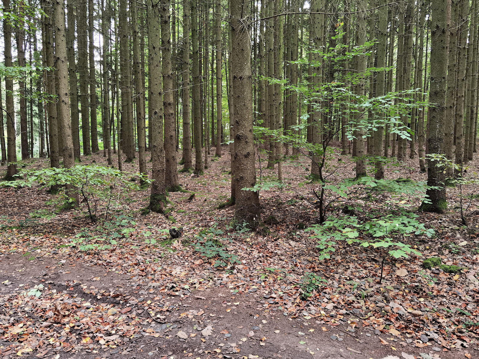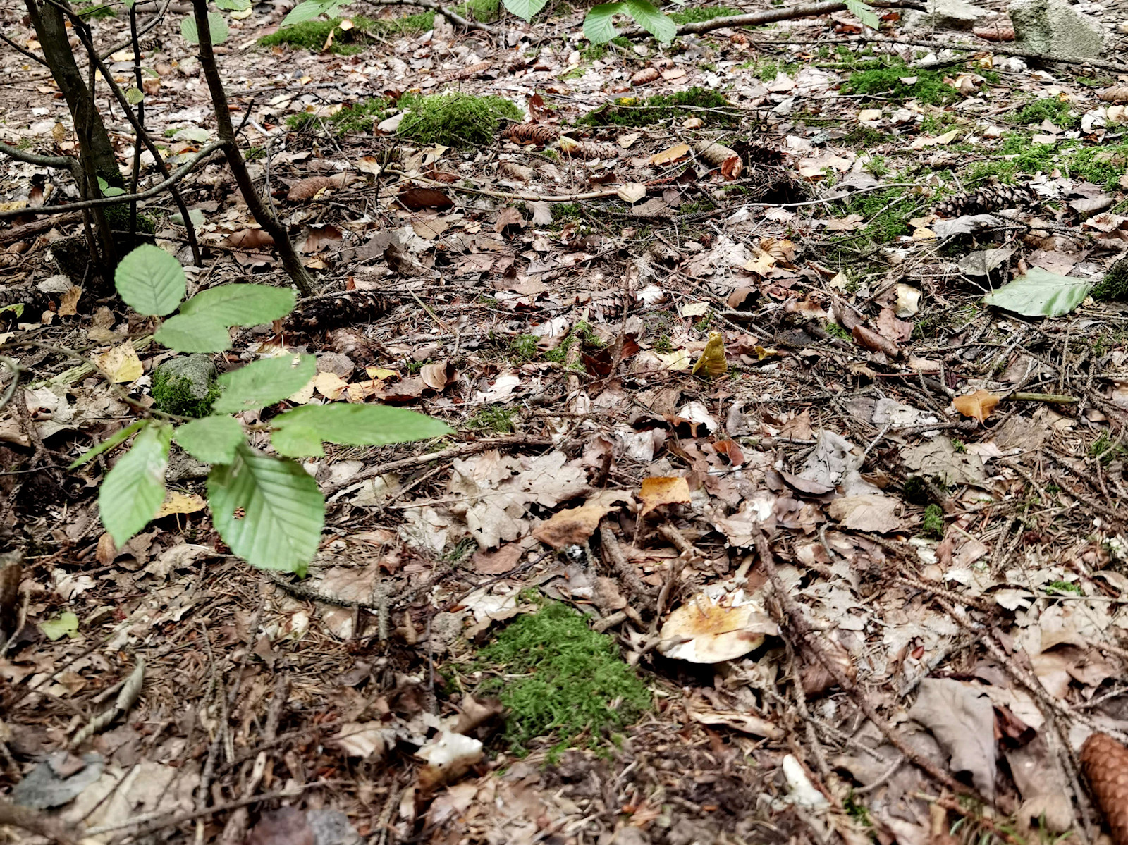 1) Fundort: Fichtenparzelle mit zwei bis drei Hainbuchen Sträuchern/Bäumchen; gegenüber vom Weg Fichten, Birke, >10m Buche und Stieleiche