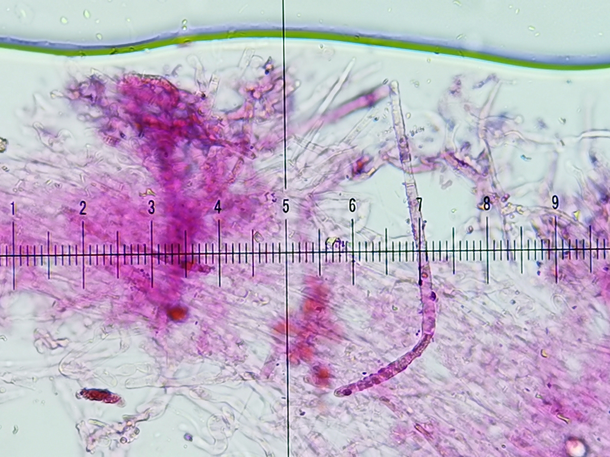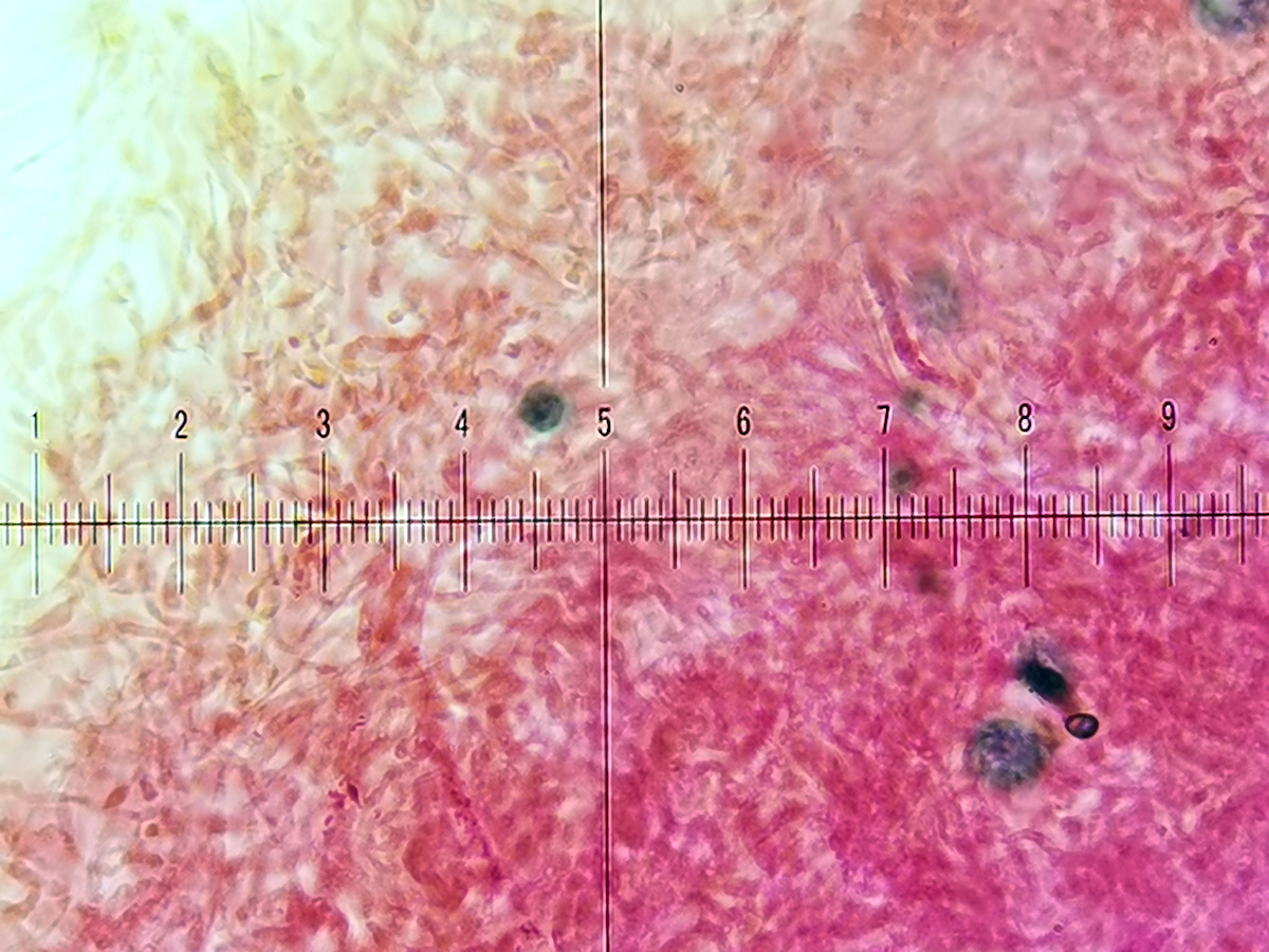 - 10x Objektiv, Sulfovanillin (SV), in der Huthaut sind keine grau-schwarz eingefärbten Pileozystiden erkennbar.