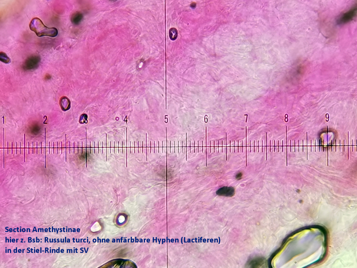 - Amethystinae ohne schwarzfärbende Hyphen (Lactiferen) - und Integroidinae mit schwarzfärbende Hyphen in der STIEL-Rinde in/mit Sulfovanillin (SV)