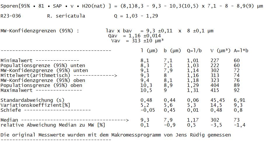 28) Sporen-Messprotokoll, der Mittelwert von 9,3 x 8 mü ist zwar hoch, aber auch SARNARI weist auf Makrosporenformen von 9,8 x 8 mü hin