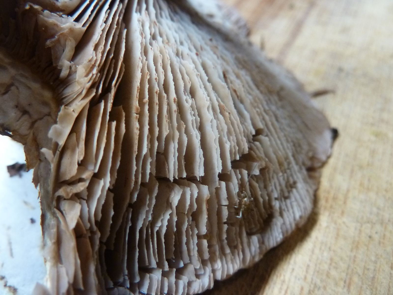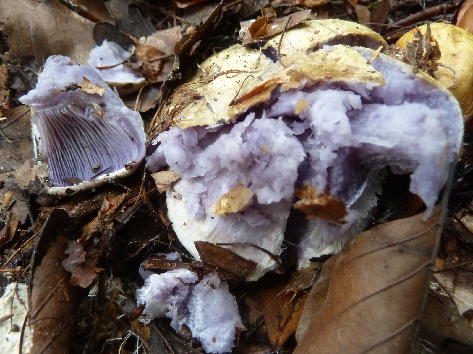 Hier die zweite Cortinarien-Kollektion vom heutigen Tag. Ich vermute den Buchen-Klumpfuß wegen der jung lebhaft violettblauen Lamellen und der ordentlich bitter schmeckenden Huthaut (Schleimschicht). Das Stielfleisch ist fast mild, kein Vergleich zur bitteren Huthaut. Huthaut ergibt mit NaOH deutliche Farbvertiefung nach ockerbraun, an anderen Stellen keine Reaktion. Geruch kaum wahrnehmbar. Markant finde ich die bei ausgereiften Exemplaren schartig-gekerbten Lamellen, dazu konnte ich nichts in meiner Literatur finden.