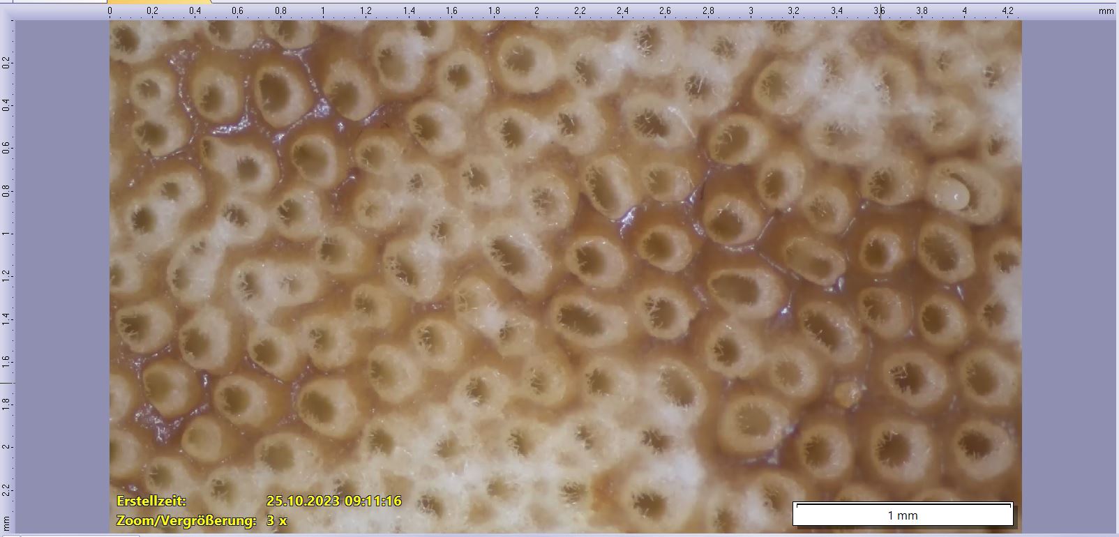 Ja gut die Poren 3 auf 1mm überschneidet sich -> der Querschnitt ist aber dann schon arg braun und die Oberfläche wollig konnte ich auch ausschliessen.