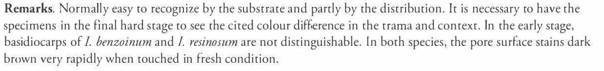 I resinosum hat (frisch) minimal kleinere Poren (etwa 3-4 Poren pro mm; I. benzoinum hat etwa 2-3 Poren pro mm)