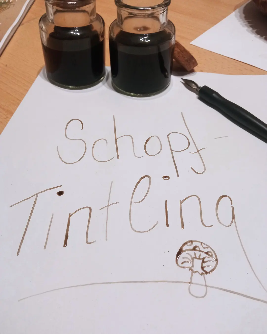 Ich hab ein paar Tintlinge aussporen lassen, das bisschen Pilzrest was übrig geblieben ist rausgesiebt. Dann ein paar Tropfen Nelkenöl für Haltbarkeit und Geruch hinzugefügt und etwas Gummi Arrabicum um es dickflüssiger zu machen. Man kann auch ziemlich gut damit schreiben aber am liebsten hätte ich es gerne noch klein wenig mehr angedickt. Wenn ich noch mehr untergemischt hätte wird die Farbe zu hell :/