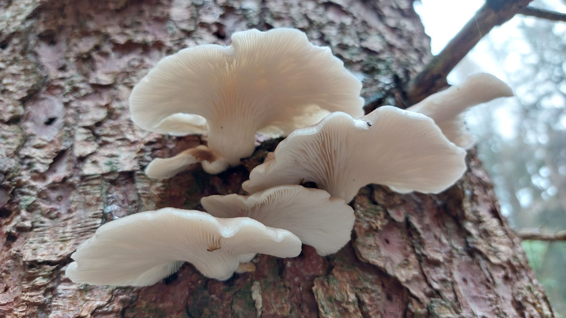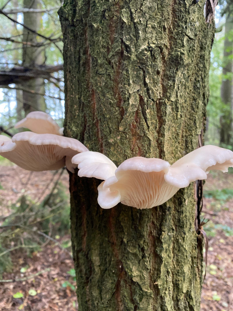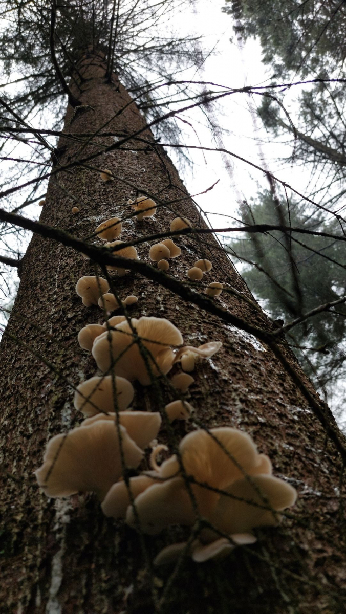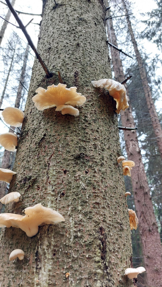 Ich würde (ob des Nadelholzes und der Jahreszeit sowie der Hutfarbe) mit meinem Anfängerwissen den Austernseitling mal ausschließen, aber da endet mein Wissen über Seitlinge dann auch schon fast. Von der Farbe her käme noch der Lungenseitling in Frage (oder?).