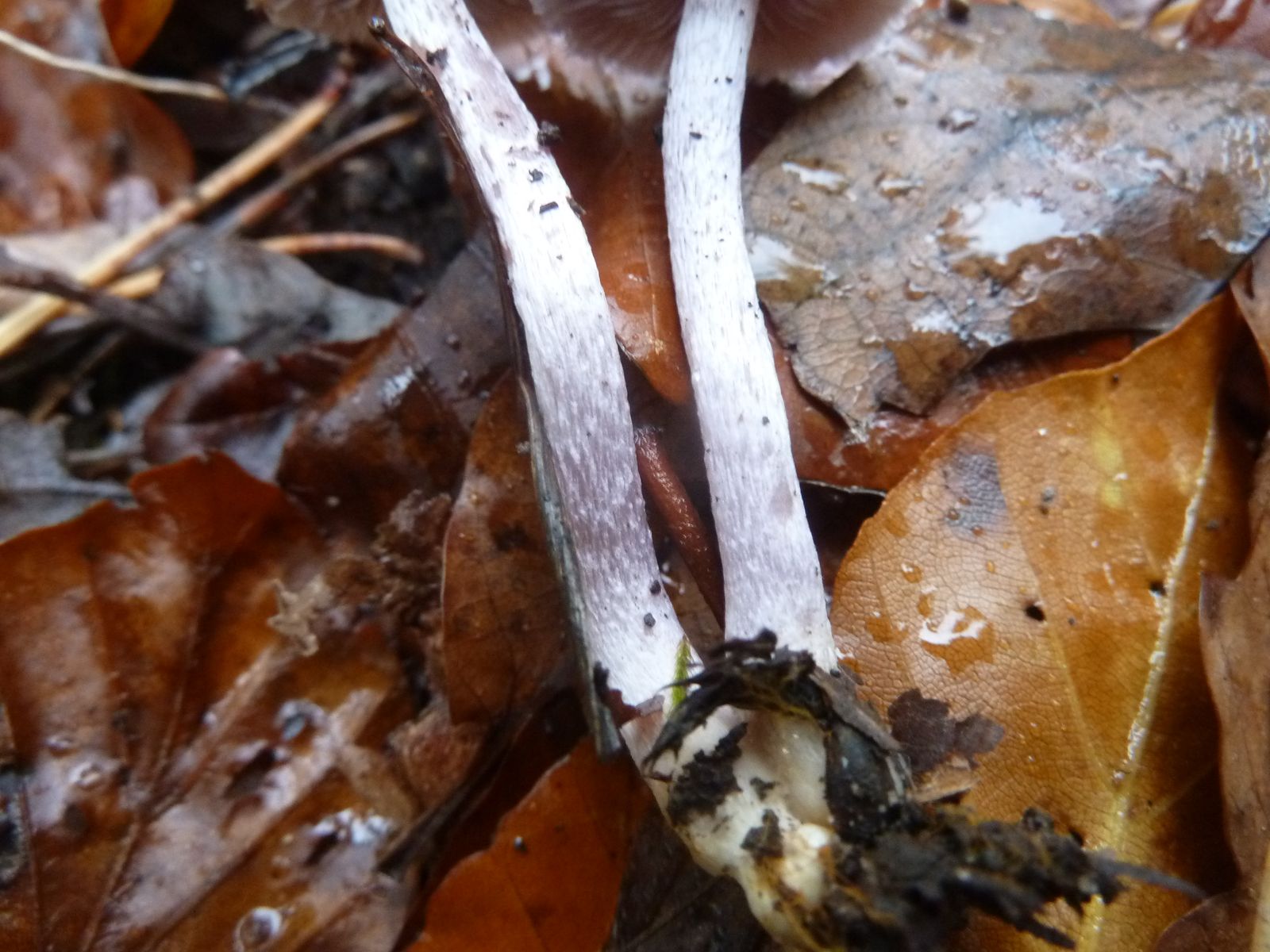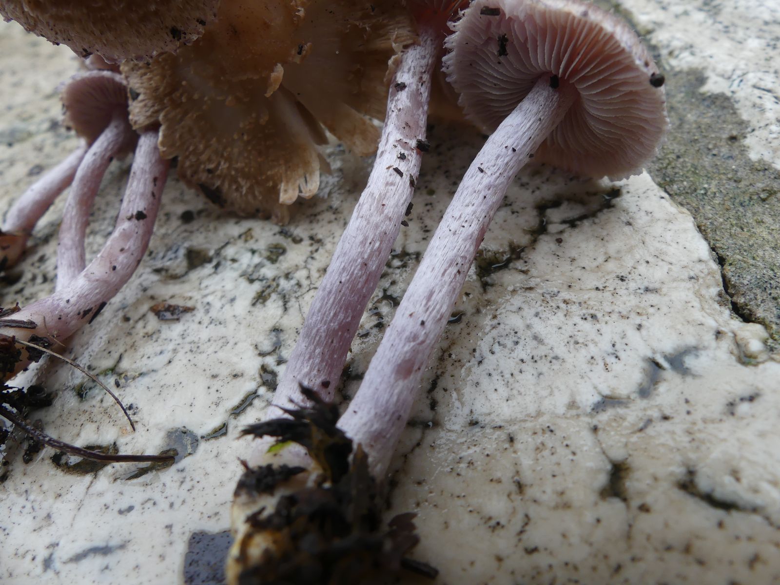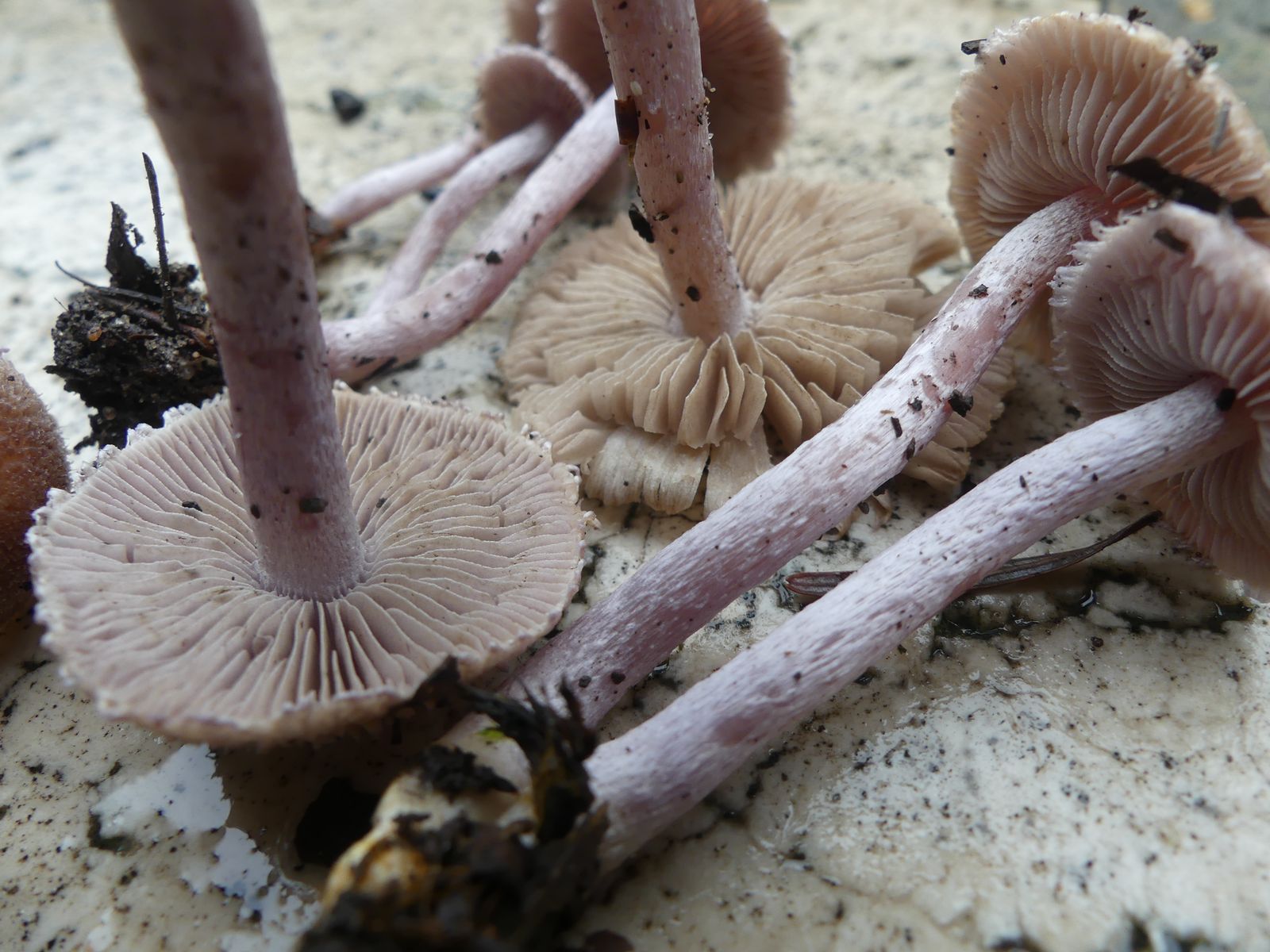 Normalerweise bin ich froh, wenn ich die Gattung Risspilz vor Ort ohne Hilfsmittel erkenne. Die (zuverlässige) Artbestimmung erfordert ja regelmäßig Mikroskop und Spezialliteratur. Allerdings soll es auch vereinzelt Ausnahmen von dieser Regel geben. Wenn ich mir die schön zartlila bzw. graulila gefärbten Stiele anschaue und - mangels Mikroskop - einfach mal einen Bilderabgleich mache, lande ich beim Grauvioletten Risspilz, der - laut neuem Kosmos Handbuch Pilze - durch den vollständig violetten Stiel über "gute Feldmerkmale" verfügt.