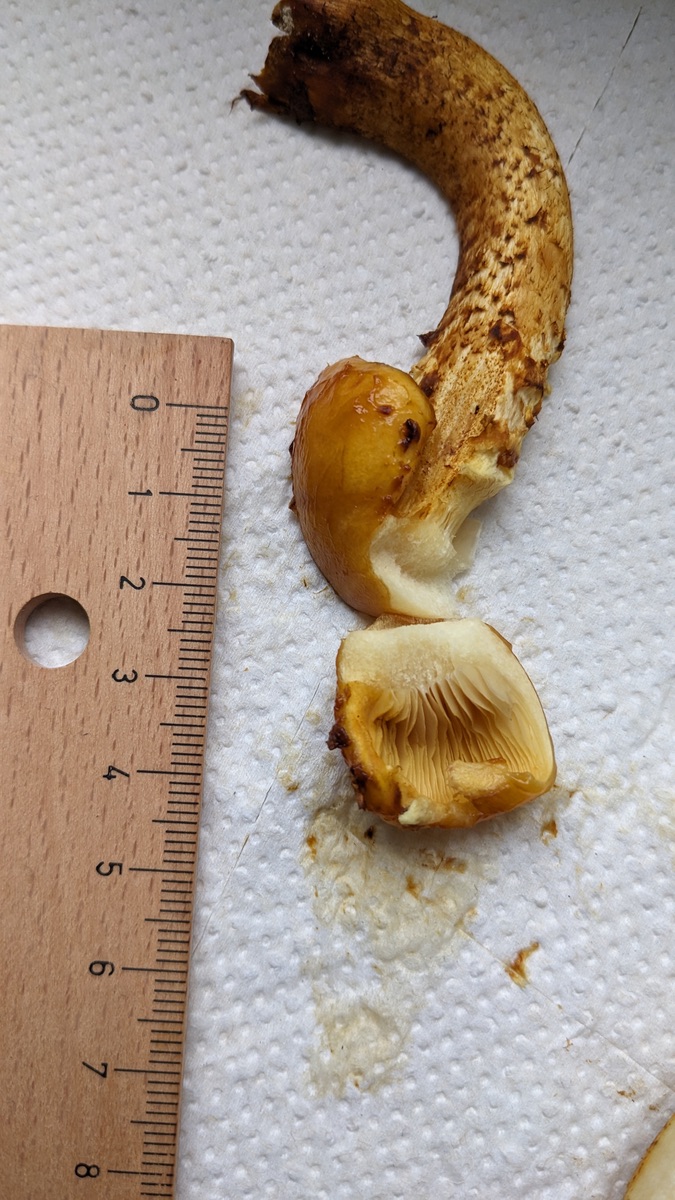 Wächst wahrscheinlich an Buche, zumindest sehr wahrscheinlich Laubholz. Am gleichen Stamm befindet sich auch ein Sommer-Austernseitling. Wächst büschelig, im Regen schleimig. Schuppen auf der Hutoberseite lassen sich leicht abwischen und sind nach Transport in einer Papiertüte zu Hause auch nicht mehr wirklich vorhanden.