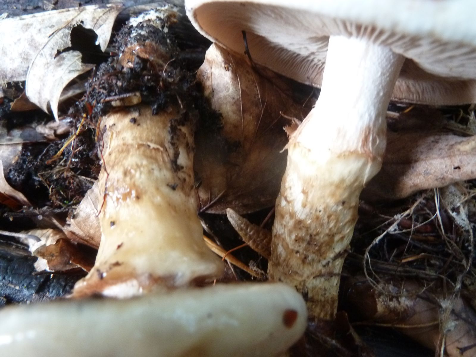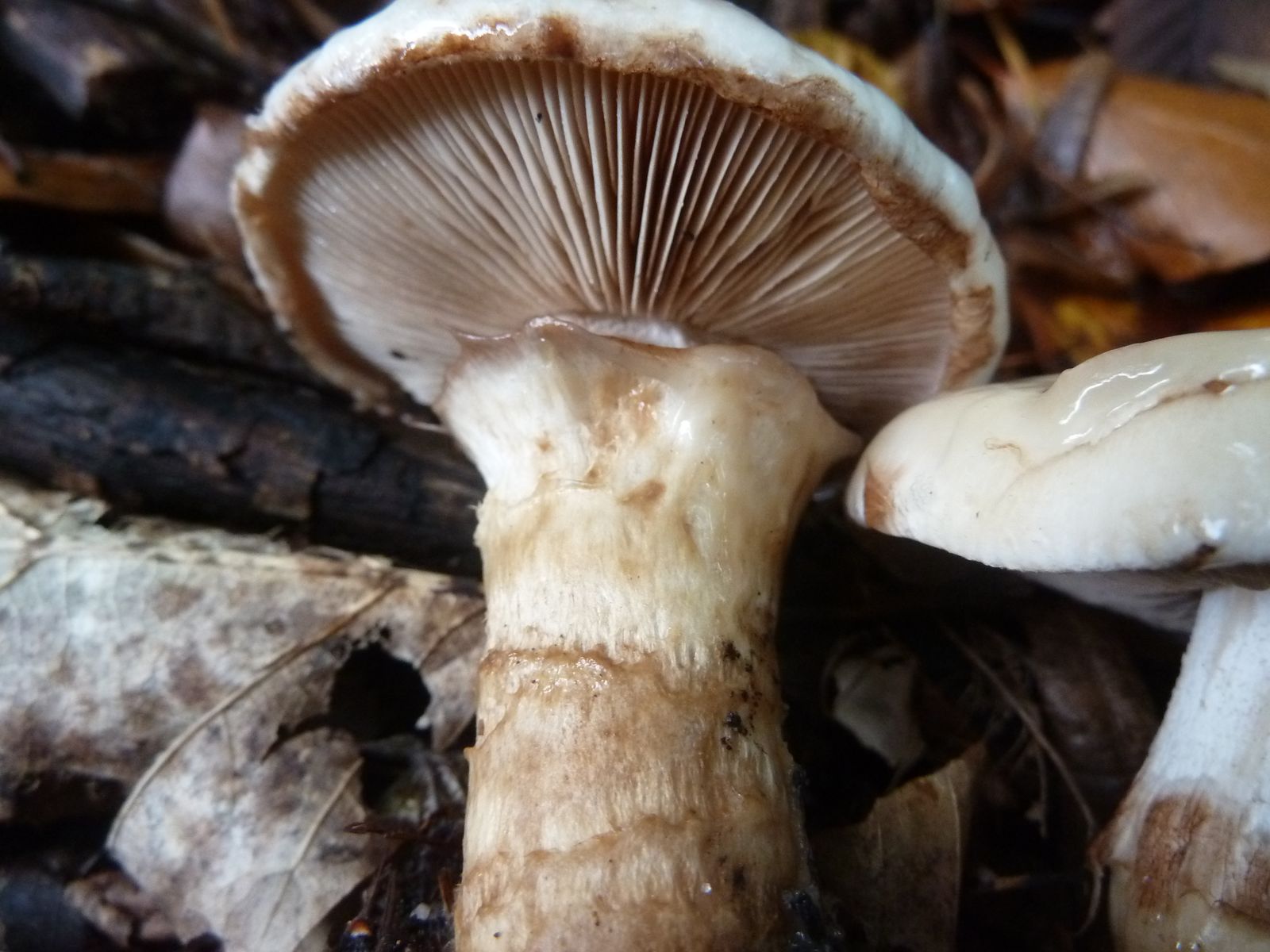 Gestern habe ich diese beiden Exemplare im Buchen-Hainbuchenmischwald gefunden. Da ich dort in den vergangenen Tagen jede Menge Cortinarien gefunden hatte, dachte ich zunächst wegen dem sehr schleimigen Hut an ein Phlegmacium bzw. dem Stiel an ein Myxacium.