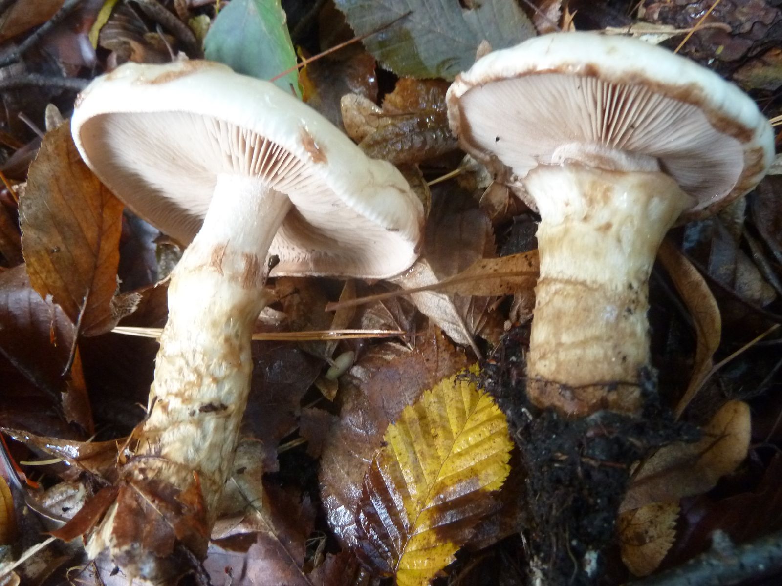 Gestern habe ich diese beiden Exemplare im Buchen-Hainbuchenmischwald gefunden. Da ich dort in den vergangenen Tagen jede Menge Cortinarien gefunden hatte, dachte ich zunächst wegen dem sehr schleimigen Hut an ein Phlegmacium bzw. dem Stiel an ein Myxacium.