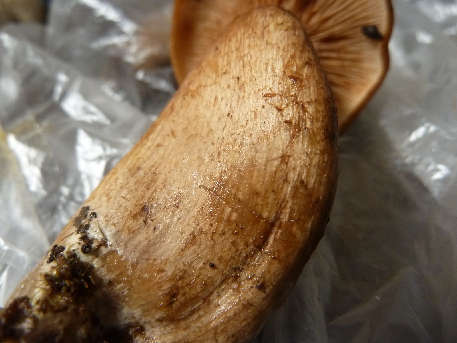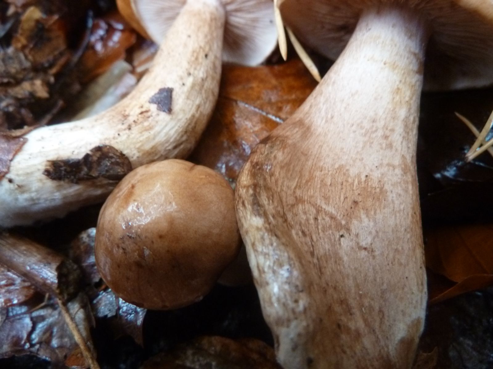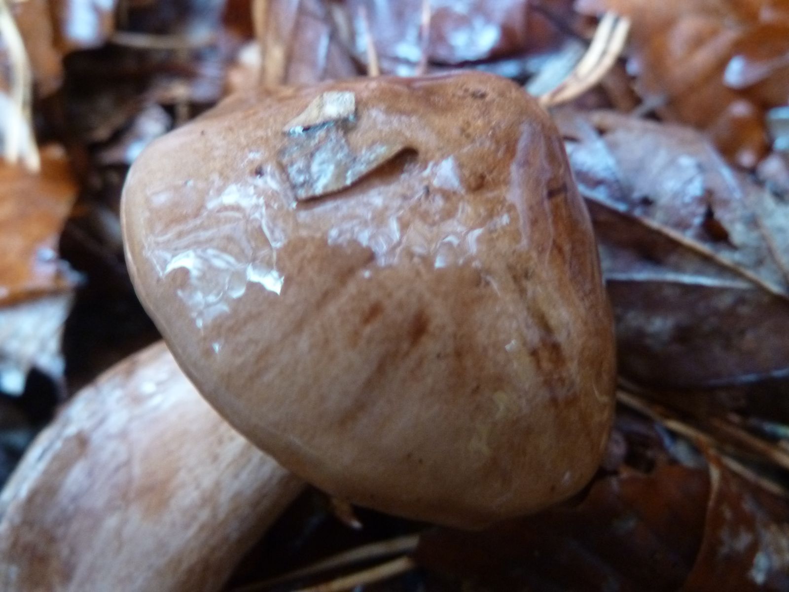 Heute im Eichen-Buchen-Kiefern-Mischwald 350 Meter über NN gefunden. Geruch mehlartig (so wie T. sejunctum), Geschmack schwach bitterlich. Auffällig ist der sehr schleimige Hut. Es gibt ja einige braune Ritterlinge, ist die recht dicke Schleimschicht für T. ustale ein Alleinstellungsmerkmal? Auffällig ist auch das schwach gelbe Stielfleisch, die Stielspitze und Hutfleisch ist weiß.