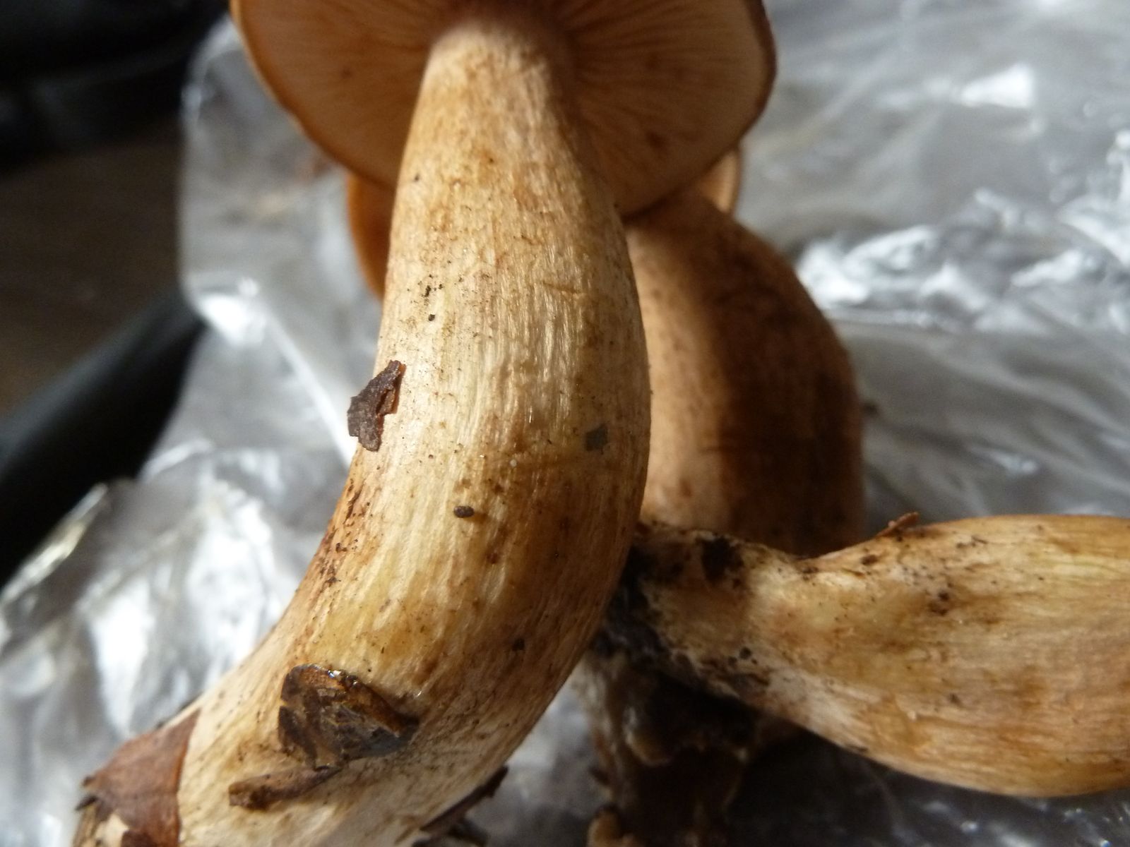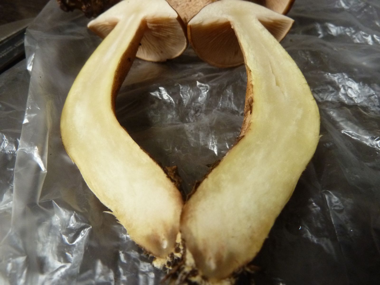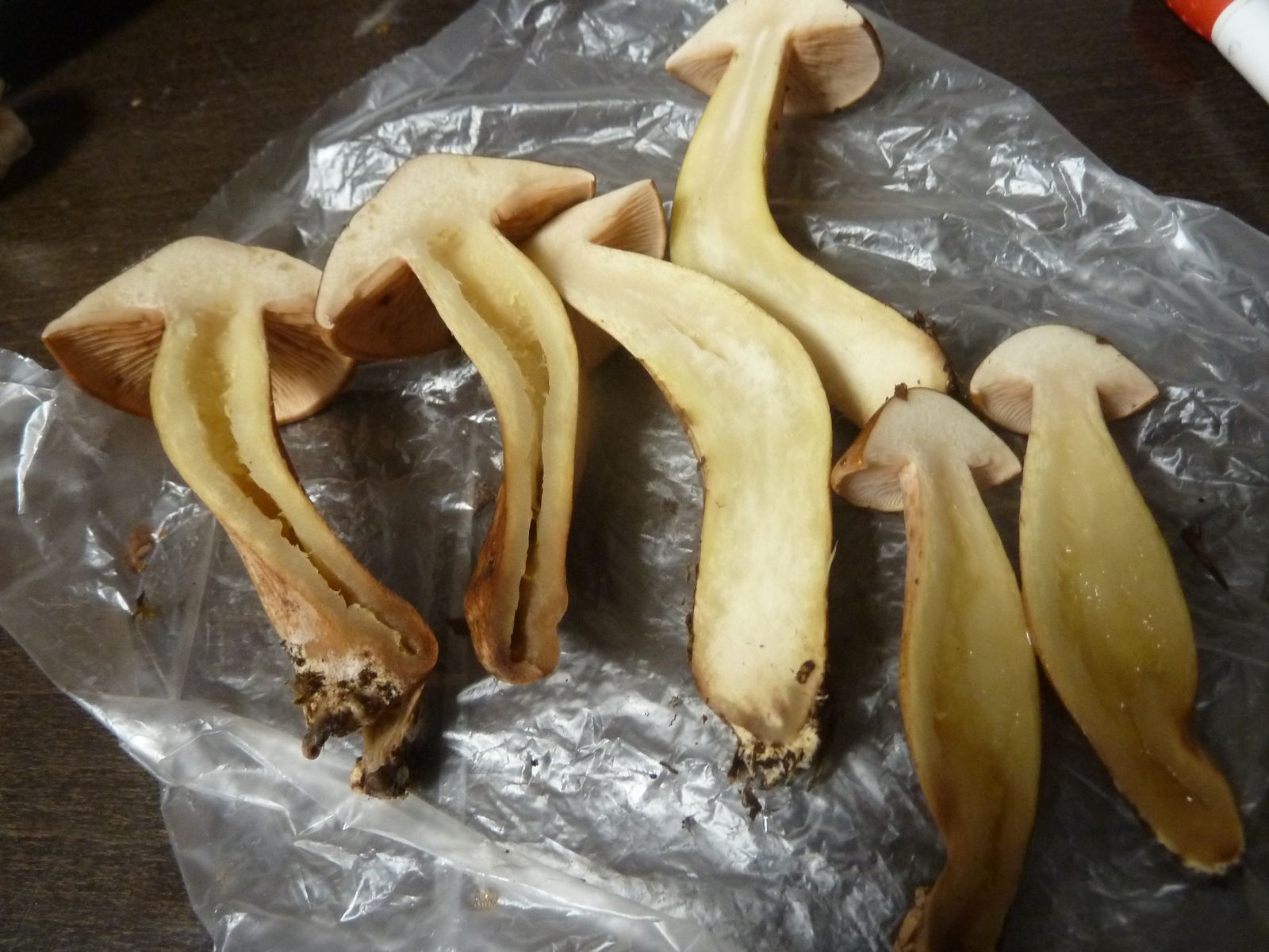 Heute im Eichen-Buchen-Kiefern-Mischwald 350 Meter über NN gefunden. Geruch mehlartig (so wie T. sejunctum), Geschmack schwach bitterlich. Auffällig ist der sehr schleimige Hut. Es gibt ja einige braune Ritterlinge, ist die recht dicke Schleimschicht für T. ustale ein Alleinstellungsmerkmal? Auffällig ist auch das schwach gelbe Stielfleisch, die Stielspitze und Hutfleisch ist weiß.