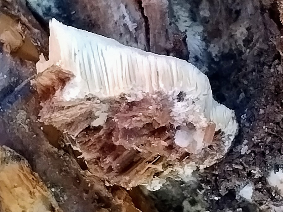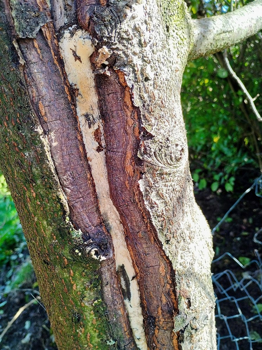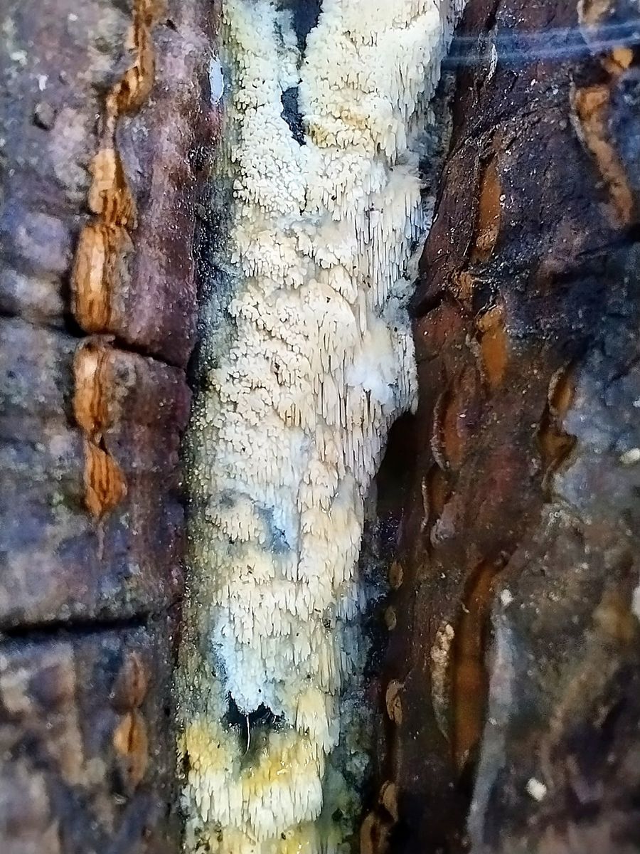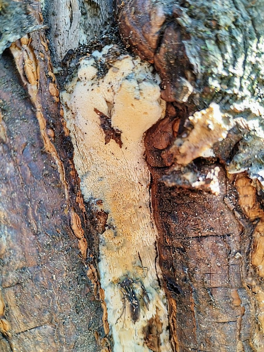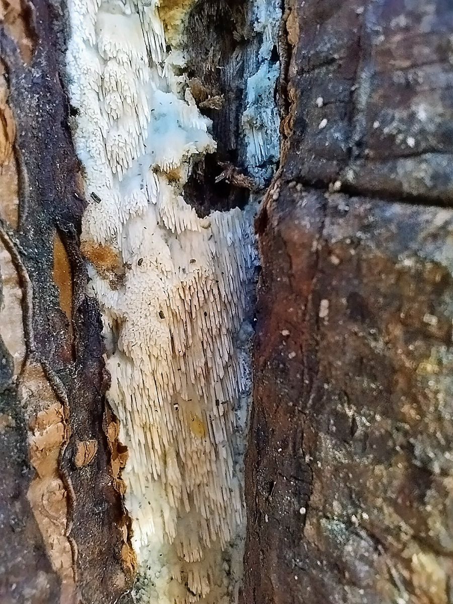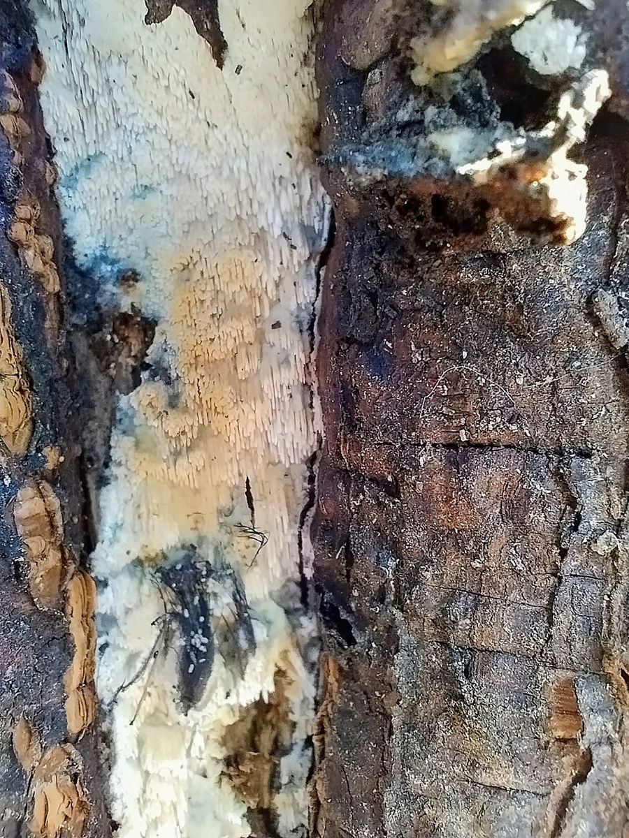Die Traubenkirsche weist entlang des Stammes eine längere Verletzung auf. Die letzten Jahre wuchsen hieraus gerne Buckeltrameten. Diese sind inzwischen verschwunden. Stattdessen sind mir diese kleinen, schmutzig-weißen bis gelblichen Stacheln aufgefallen. Der Fruchtkörper scheint noch recht jung zu sein, die Stacheln bisher maximal 2-3 mm lang.