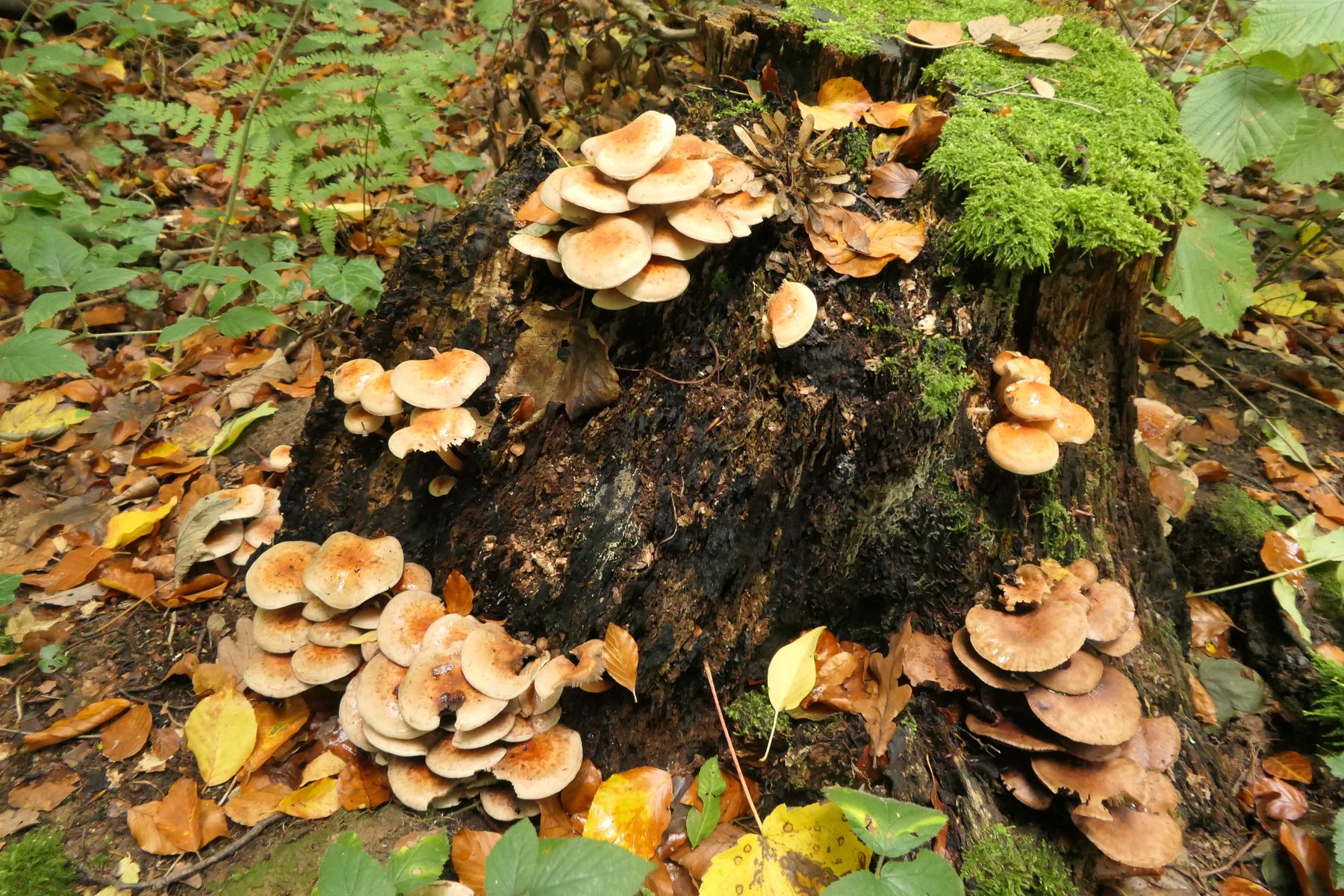Bild 1 Fundsituation - Braunrottender Baunstumpf mit Pilzbüscheln