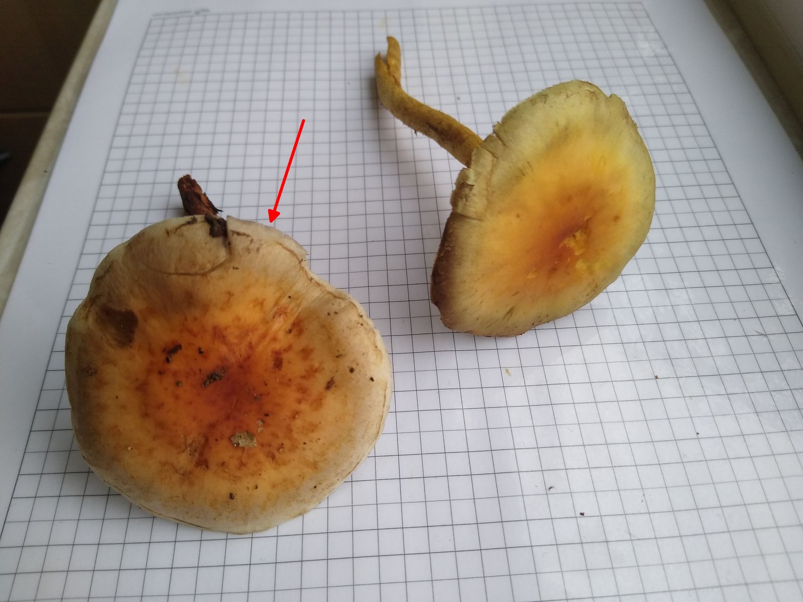Die bräunlichen Schüppchen erinnern an Pholiota; Pholiota hätte aber braune Sporen.