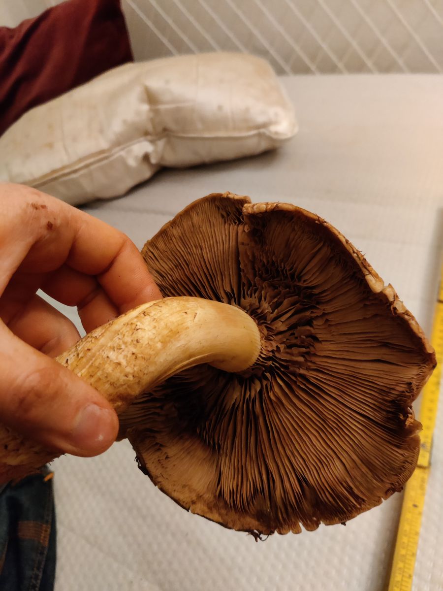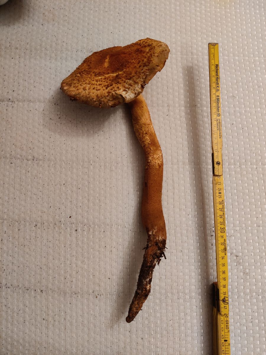 Ich wurde nicht ganz schlau aus den Bestimmungsvorschlägen meiner App und einer Internetrecherche. Ich dachte kurz an den spindeligen Rübling, weil ich den in einem Video gesehen hatte und der Stiel hier ähnlich wurzelig gewunden ist. Aber der Hut sieht anders aus und die Größe passt auch nicht, mir fehlen gerade nur die Alternativen...