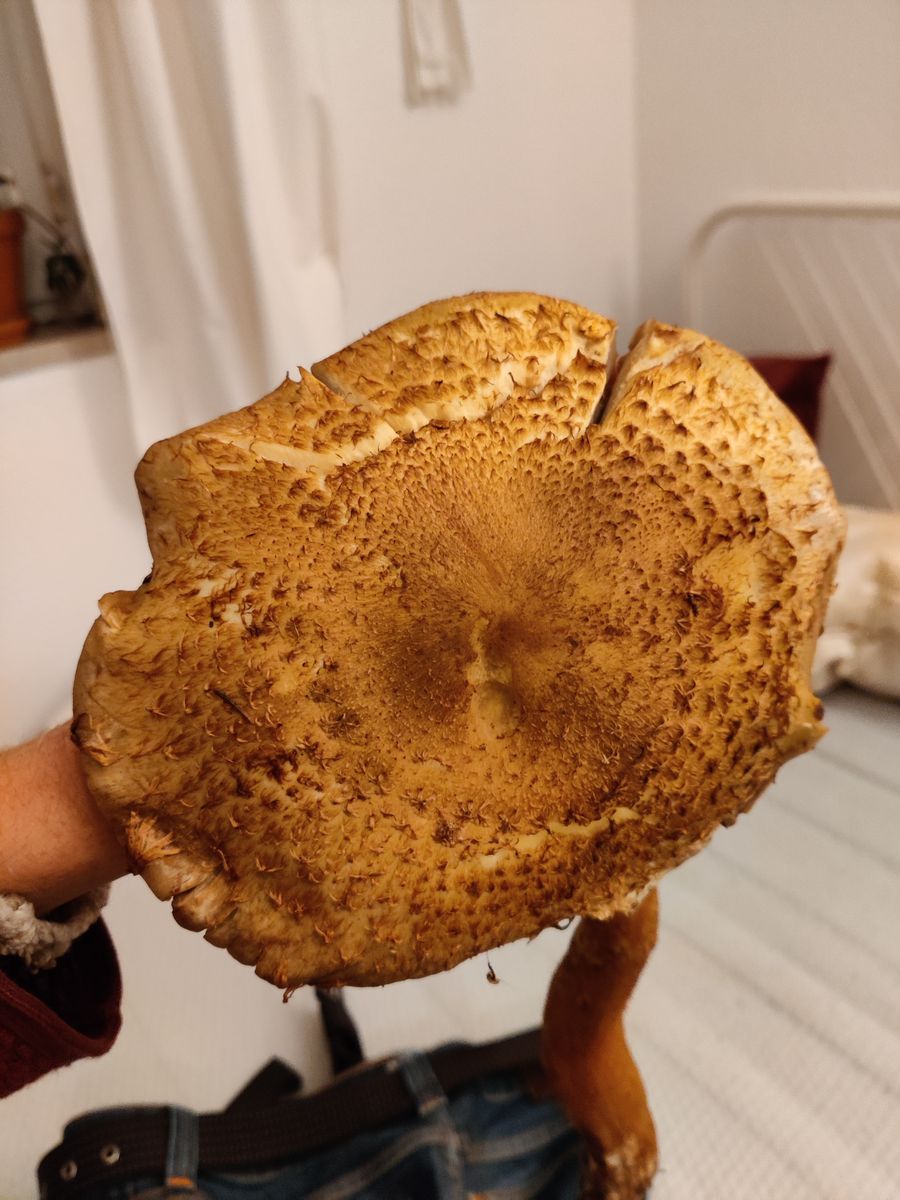 Insgesamt wirklich ein sehr stattlicher Pilz, der in einer kleinen Gruppe direkt neben/übereinander aus einem Baumstumpf herauswuchs (vermutlich aus einem Astloch, oder hat sich die „Wurzel“ des Pilzes selbst reingefressen?). Der Hutdurchmesser war glaub ich so um die 18 cm, die gesamte Länge ca. 40 cm. Der Stiel ist sehr dick, fest und etwas verdreht. Die markanten Schuppen auf dem Hut erinnern von ihrem flockigen Erscheinungsbild her etwas an den Parasol, sind aber recht fest mit dem Hut verbunden und kaum abwischbar. Die Lamellen reissen beim darüberstreifen gerne etwas quer ein, splittern aber nicht wie bspw. bei Täublingen ab. Der Geruch kam mir etwas säuerlich, pilzig, aber auch modrig vor.
