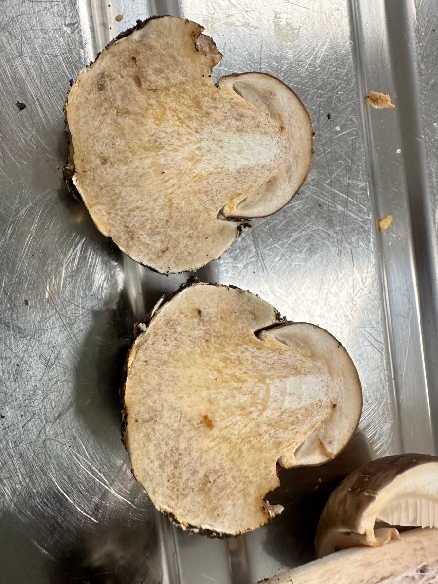 Na, immerhin sieht man, dass die Pilze nach dem Durchschneiden röten. Wahrscheinlich nach dem (etwas zu frühen) Fotoshooting noch viel stärker. Damit gehört der Pilz in die Safranschirmlingsecke (Gattung Chlorophyllum).