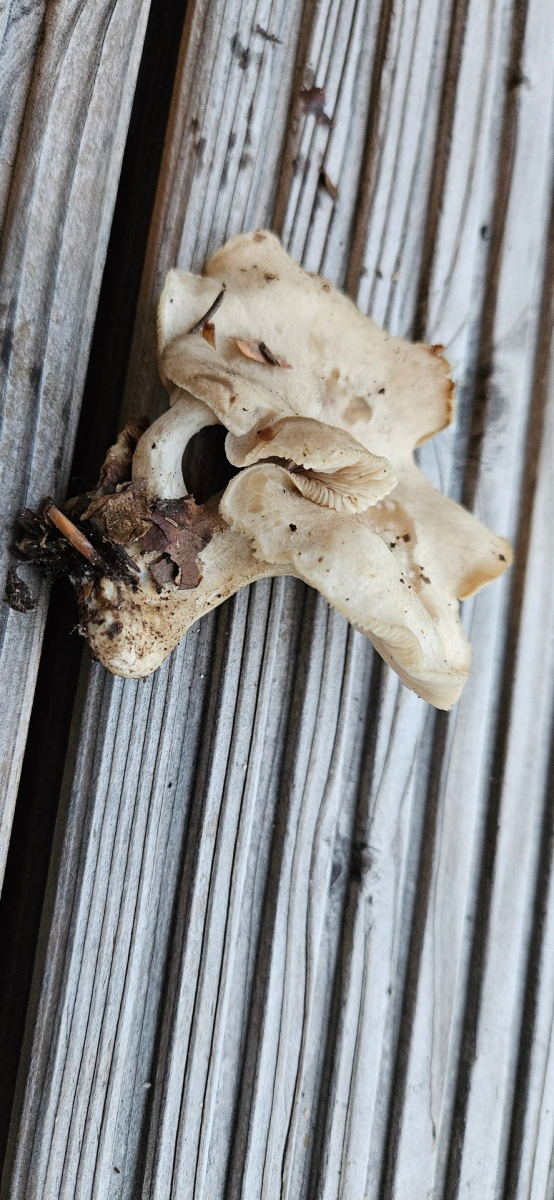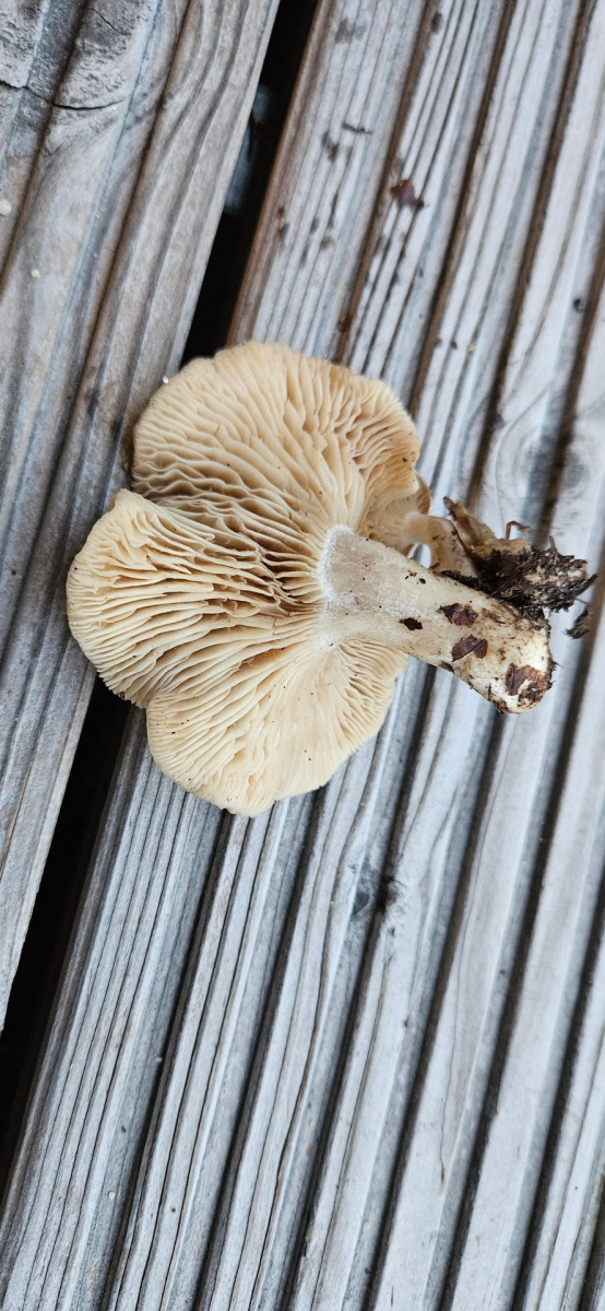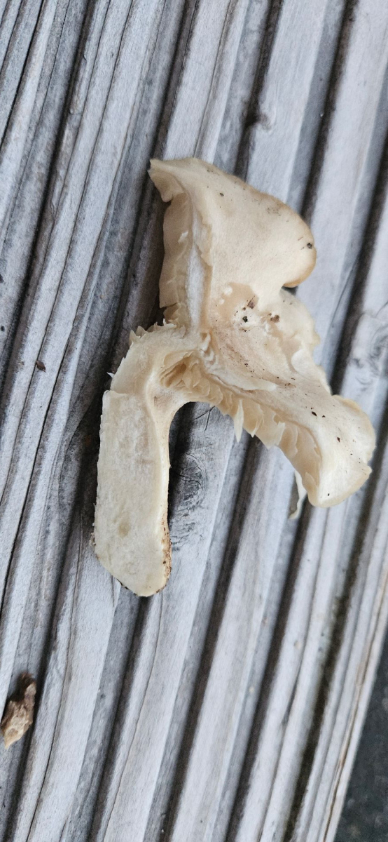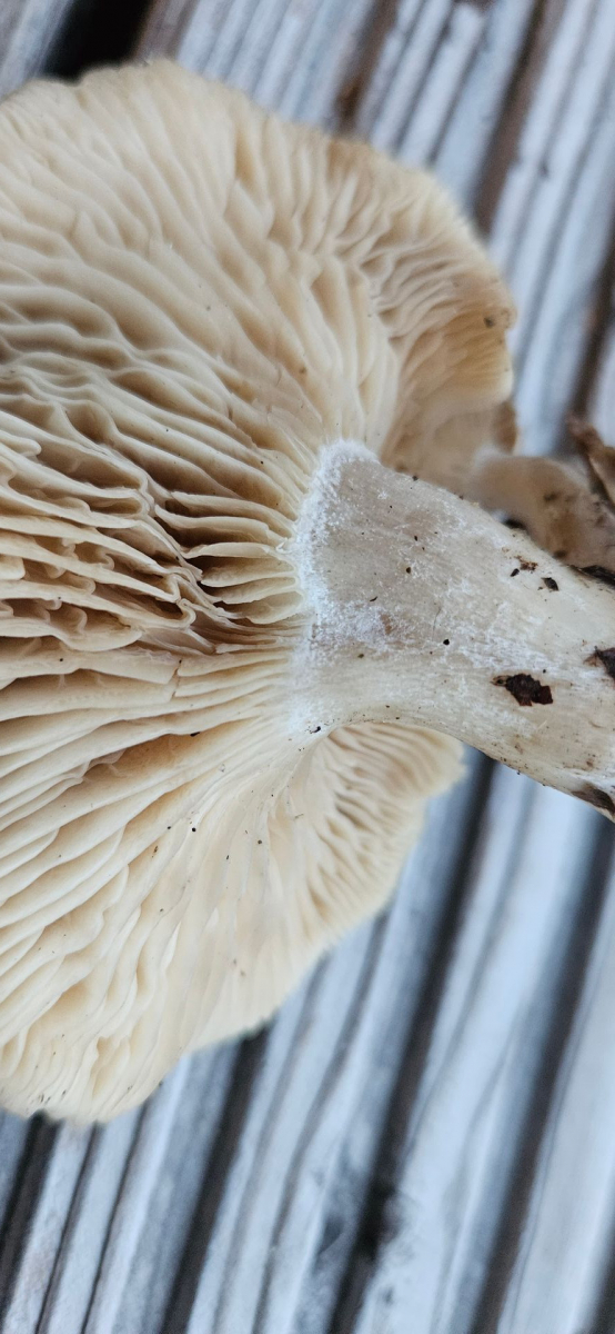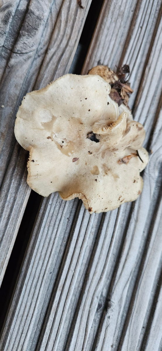 Fundort Buchen-dominierter Mischwald, sauer. Hut cremefarben mit gräulicher Note, Hutoberfläche glatt, mit eingeschossener Luft unter der Huthaut und damit an Bleiweißen Trichterling erinnernd. Lamellen mehr oder weniger gleichfarbig wie Hut, mäßig gedrängt, kaum am Stil herablaufend. Auffällig apprupter Lamellenansatz. Stiel nicht ganz rund, eher kurz. Wie Hutoberfläche auch am Stiel bereift wirkend. Deutlich gräulicher als der Hut. Fleisch heller.