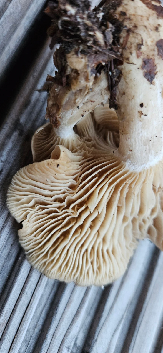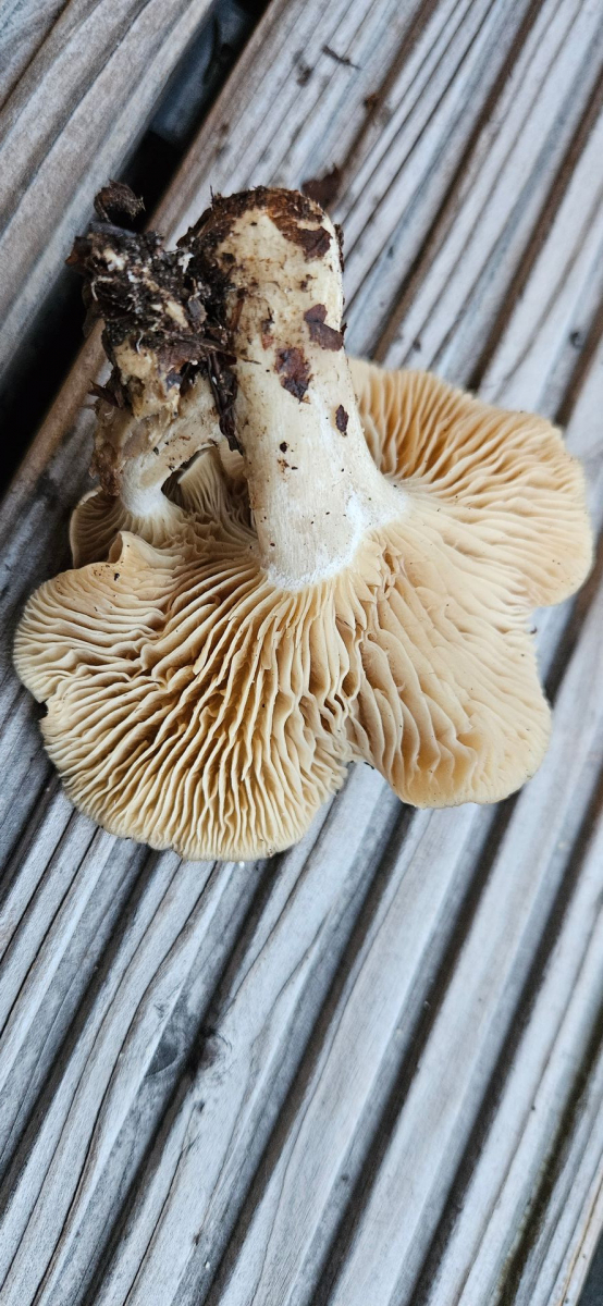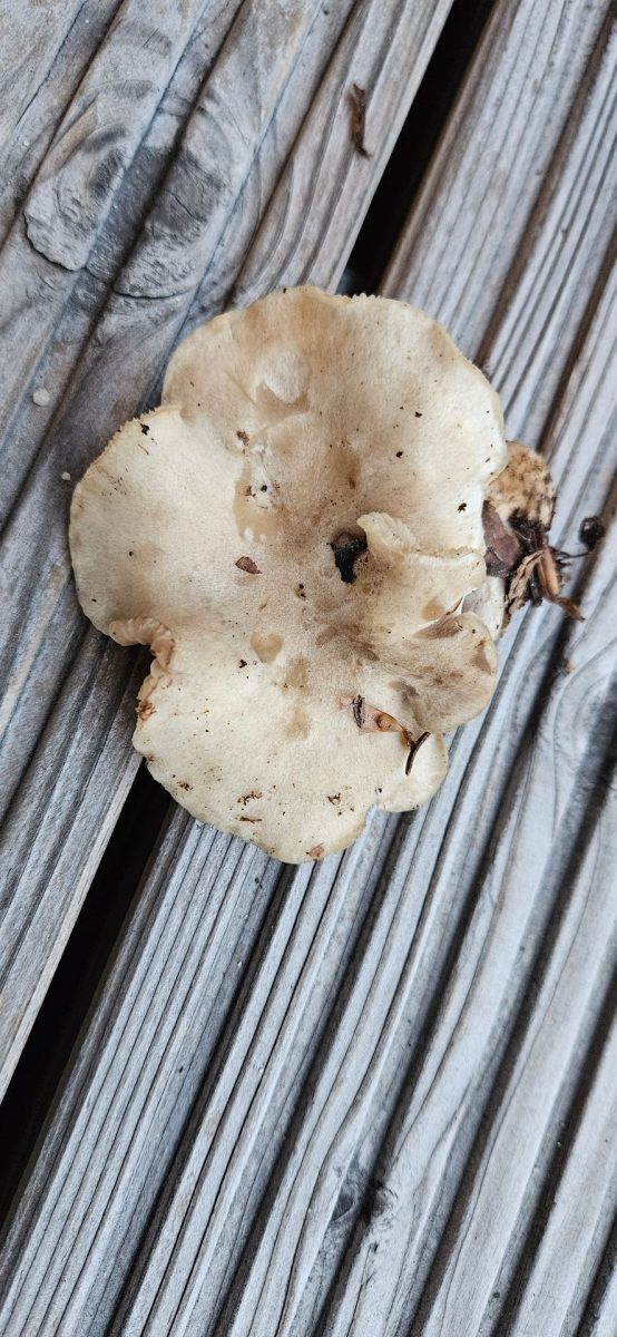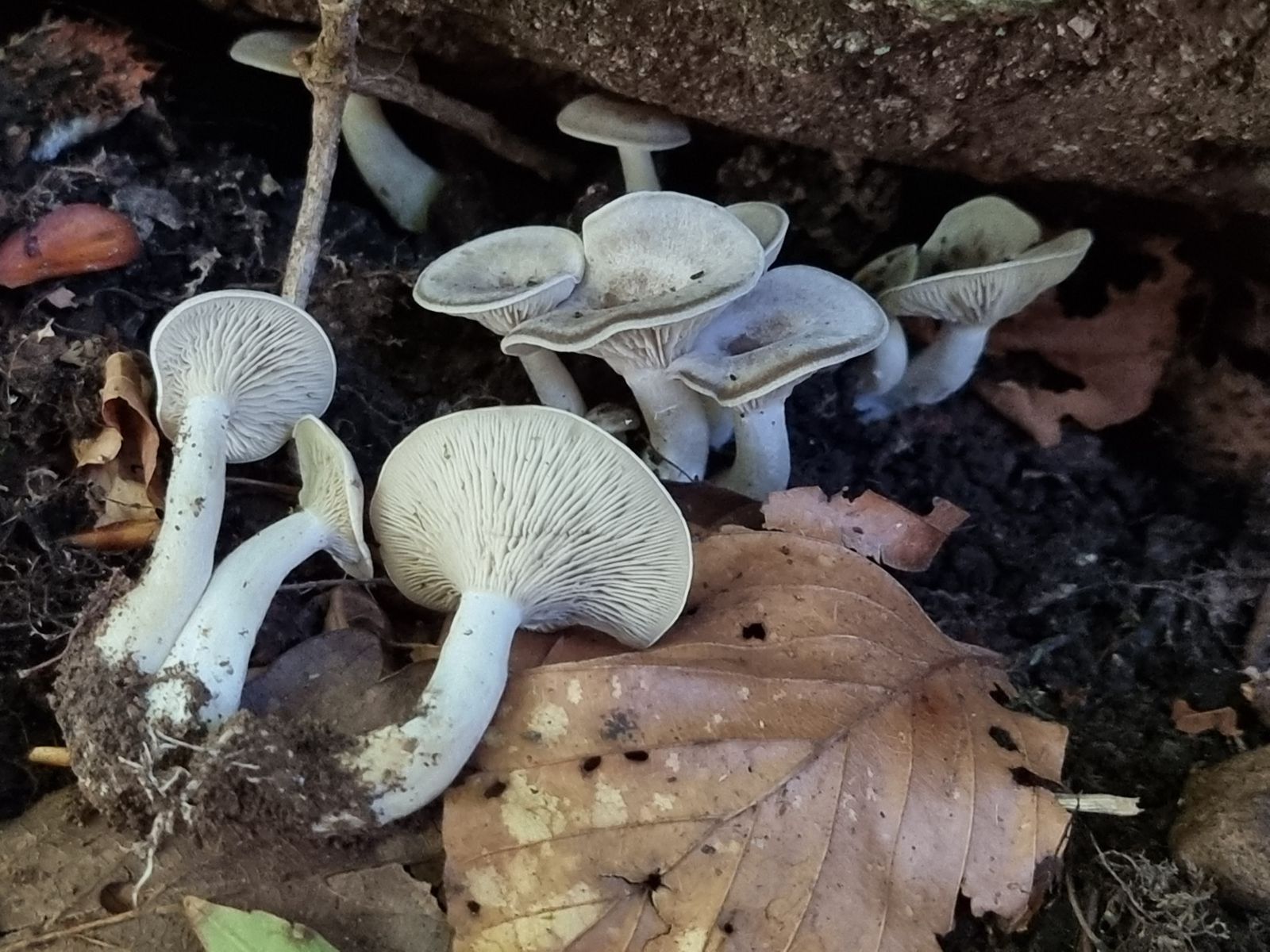 Fundort Buchen-dominierter Mischwald, sauer. Hut cremefarben mit gräulicher Note, Hutoberfläche glatt, mit eingeschossener Luft unter der Huthaut und damit an Bleiweißen Trichterling erinnernd. Lamellen mehr oder weniger gleichfarbig wie Hut, mäßig gedrängt, kaum am Stil herablaufend. Auffällig apprupter Lamellenansatz. Stiel nicht ganz rund, eher kurz. Wie Hutoberfläche auch am Stiel bereift wirkend. Deutlich gräulicher als der Hut. Fleisch heller.