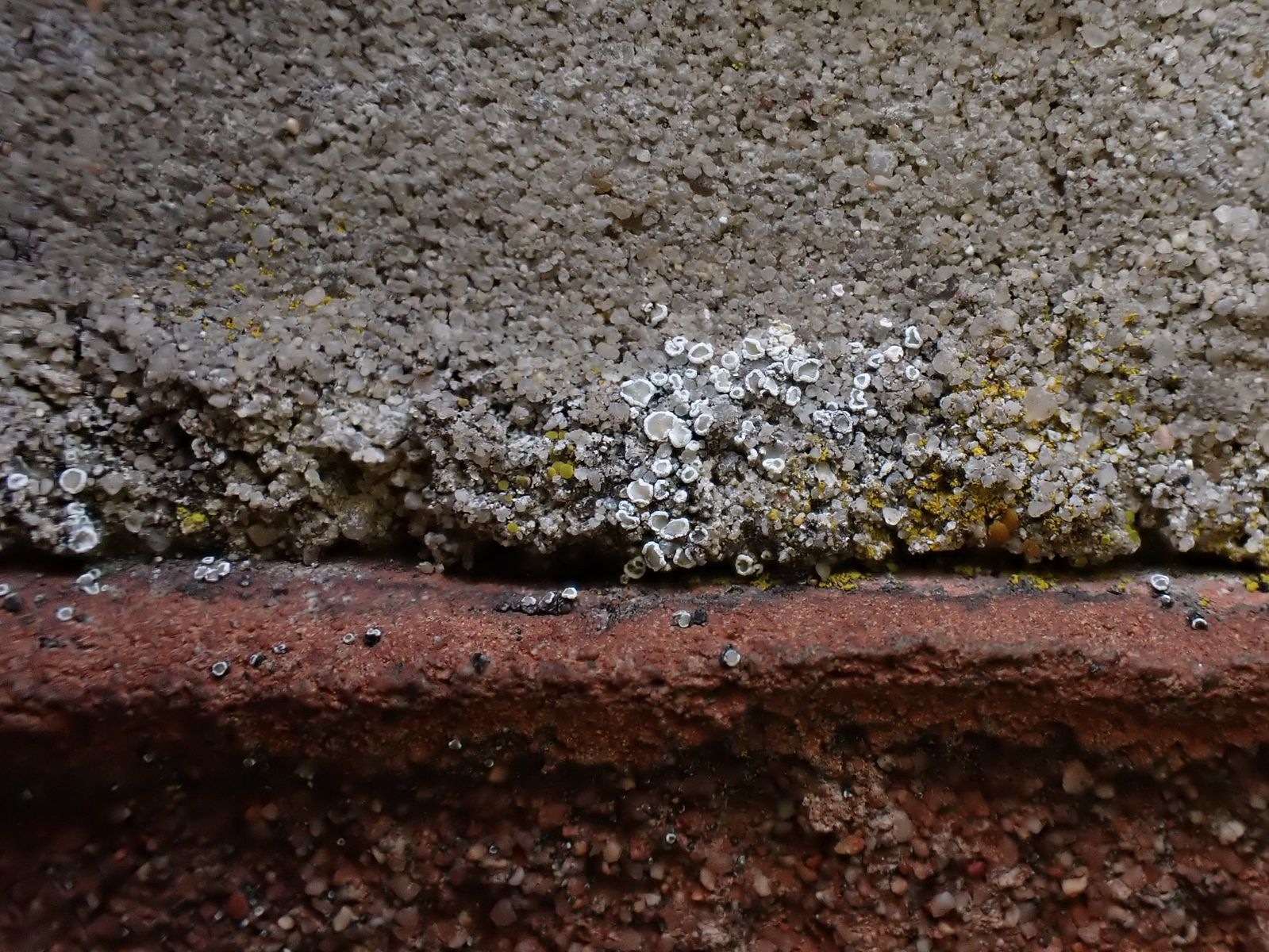 Weiße Flechte in Mauerfuge: Lecanora sp.