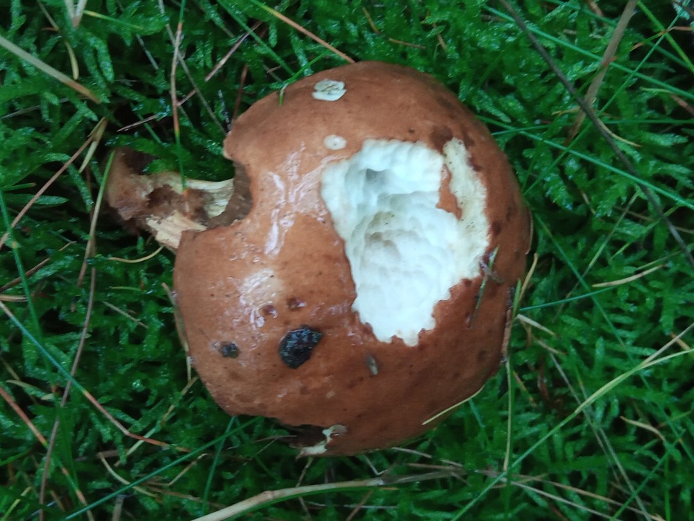 Gestern waren alle Pilze gewässert, durch Dauerregen. Im Kiefern, Lärchen, Eichen, Birkenwald, ein glänzender brauner Pilz. Von weitem dachte ich noch an Butterröhrling. Aber beim Blick darunter war ich eher bei einem Lärchenröhrling. So gräuliche Röhren passen ja dazu. Die schmierige Huthaut, die abziehbar ist, passt auch. Nur die braune Huthaut sieht nicht nach Graubraunem Lärchenröhrling aus. Oder gibt es noch Varietäten? Bei uns gibt es eigentlich nur den Goldröhrling/Lärchenröhrling.