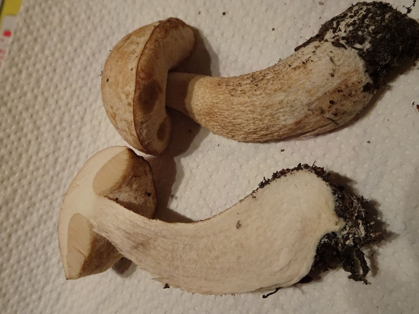 Anschnitt/Fleisch: weiß, aber sofort anfangend nach und nach sich schnell rötlich zu verfärben, hauptsächlich unterhalb Hut = Stielbereich. Nach 30 Minuten schönes dunkles rot mit tendenz zu schwarz/violett. Keine blau, grün, gelbfärbung, auch nicht an der Stielspitze.