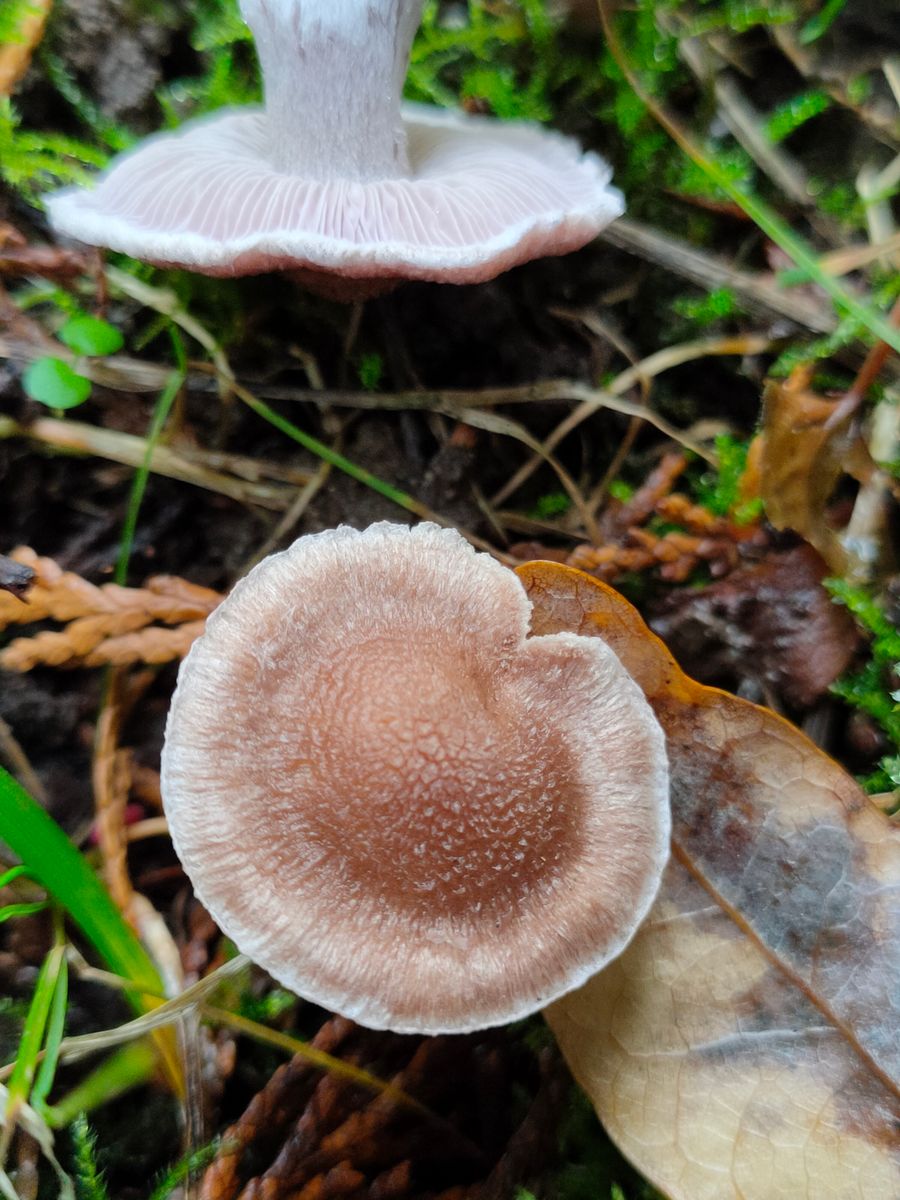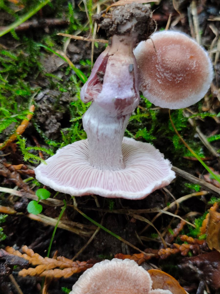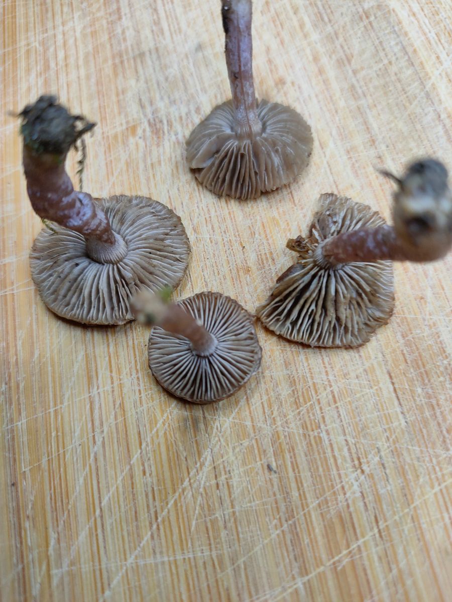 • Hey Uwe, die sind wirklich sehr klein 2-3 cm im Hutdurchmesser. Die Farbe der Hutmitte ist in beiden Bildern braun. In den letzten Bildern deutlich verblasst. Im Hut sind keine Röttöne vorhanden. Nur der Stiel zeigt violette Farben.