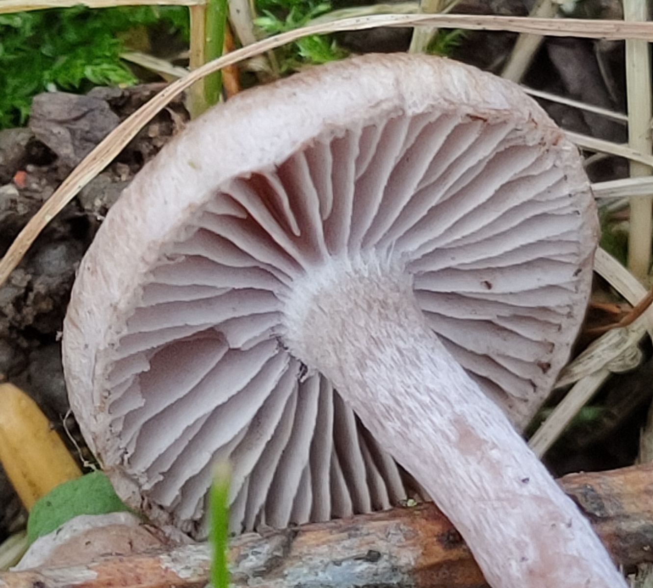 Die grauweissen Lamellen sind ausgebuchtet angewachsen und laufen mit Zahn am Stiel herunter.