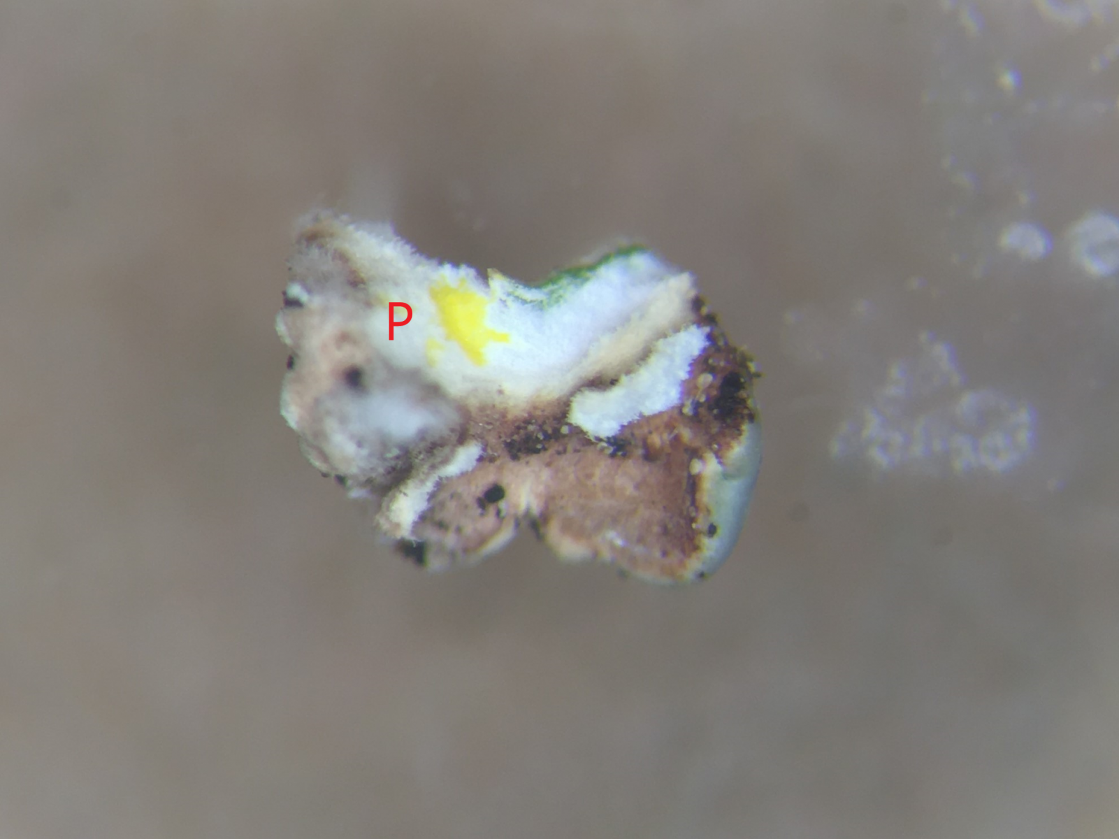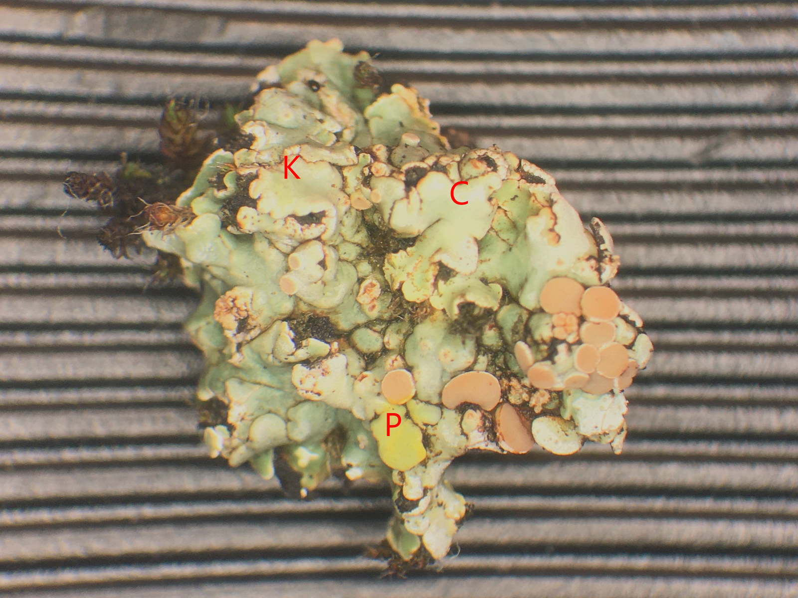 Die Färbung mit P ist meines Wissens nach relativ beständig, ein paar Minuten warten verändern da nix. Auf die Oberfläche des Thallus trägt man das Reagenz auf, wenn man eine Reaktion des Cortex erwartet und sehen möchte. In deinem Fall braucht es halt so lange, weil nicht der Cortex reagiert, sondern die Medulla tief darunter und erst nach einer ganzen Weile die Verfärbung bis zur Oberfläche hochdiffundiert ist und die Oberfläche färbt. Um zu erkennen, wo die Reaktion stattfindet, hilft eben nur ein irgendwie gearteter Querschnitt, den man dann gezielt untersucht.