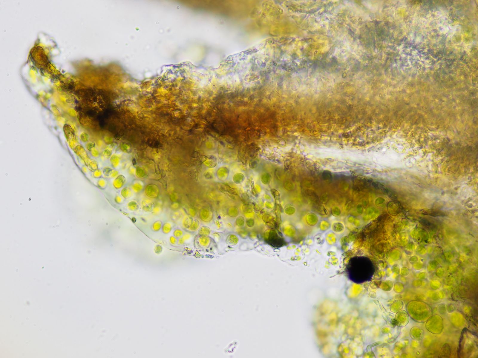 Mein Plan einen schönen Schnitt durch einen Thalluslappen zu machen und dann unter dem Mikroskop die Reagenzien durchzuziehen musste ich wegen der Bröseligkeit leider verwerfen.